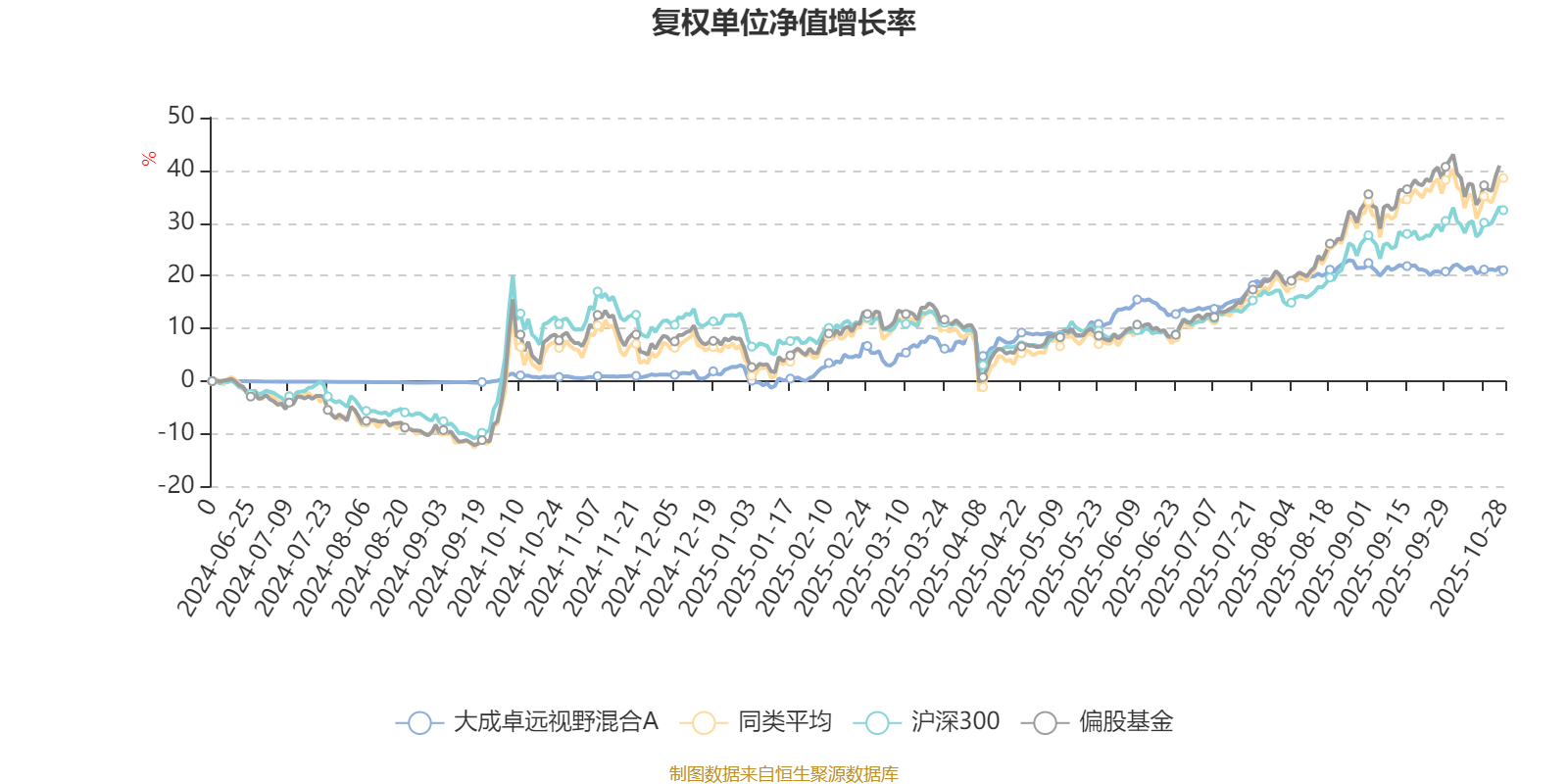 截至10月28日,大成卓远视野混合A近三个月复权单位净值增长率为1.68%,位于同类可比基金578/621;近半年复权单位净值增长率为11.04%,位于同类可比基金560/619;近一年复权单位净值增长率为19.96%,位于同类可比基金407/611。