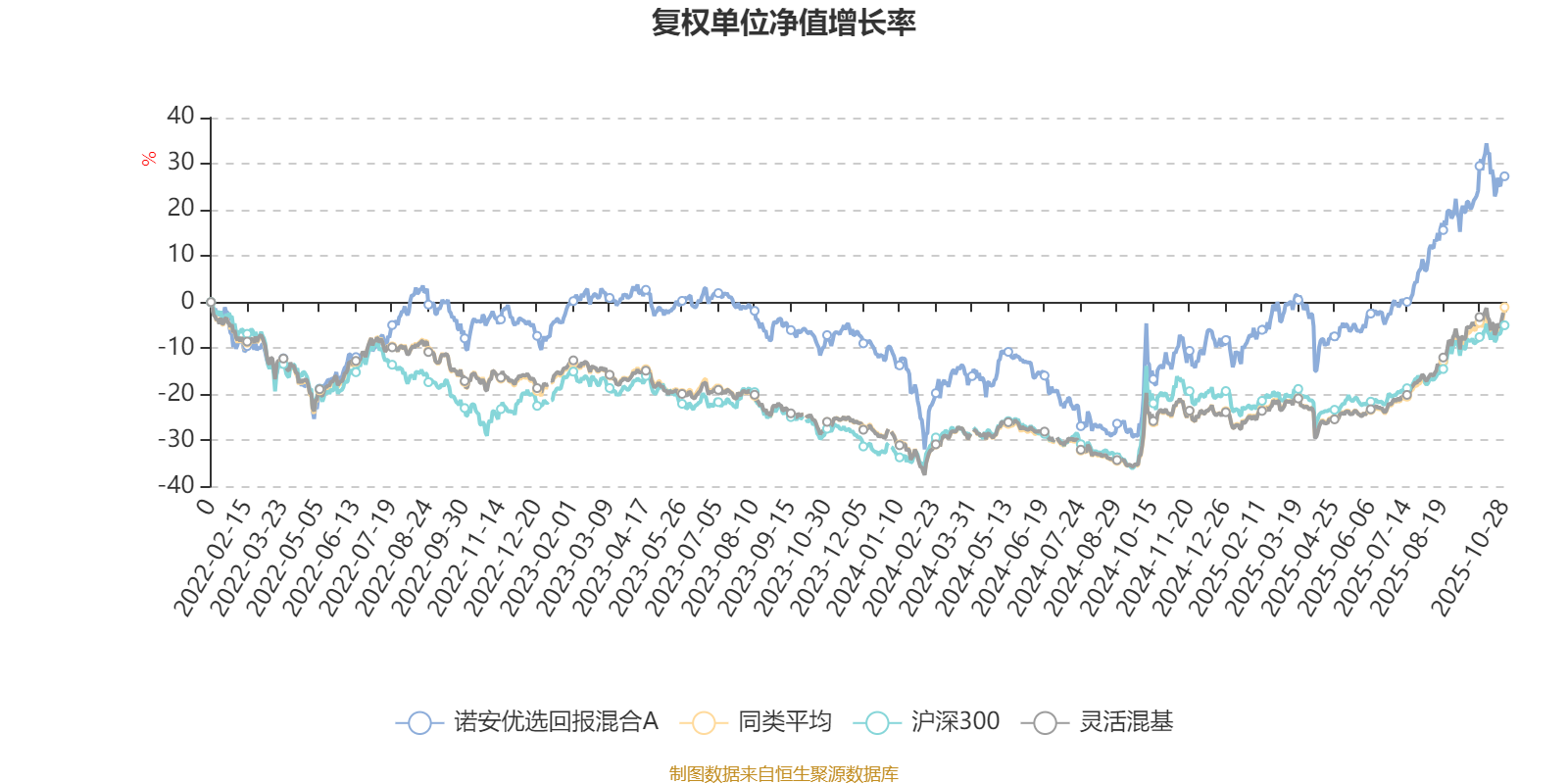 截至10月28日,诺安优选回报混合A近三个月复权单位净值增长率为18.66%,位于同类可比基金408/1287;近半年复权单位净值增长率为38.63%,位于同类可比基金303/1287;近一年复权单位净值增长率为42.84%,位于同类可比基金226/1287;近三年复权单位净值增长率为34.11%,位于同类可比基金306/1286。