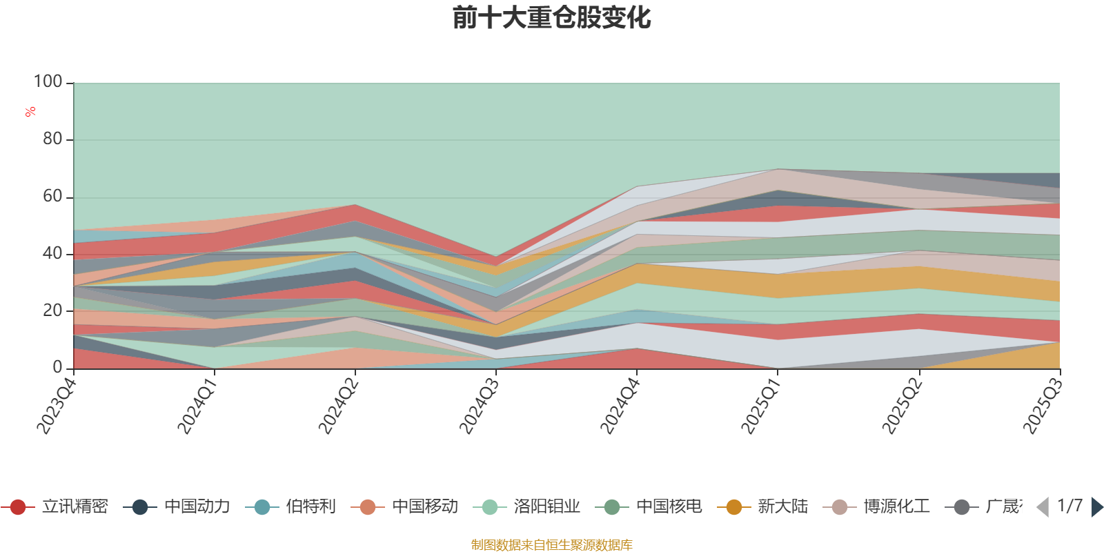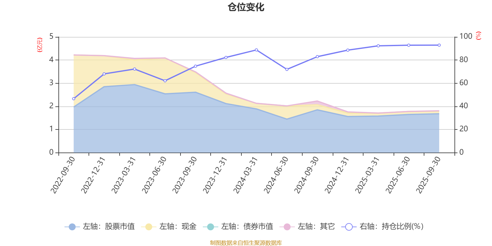 据定期报告数据统计,近三年平均股票仓位为80.8%,同类平均为85.66%。2025年三季度末基金达到92.89%的最高仓位,2022年三季度末最低,为46.62%。