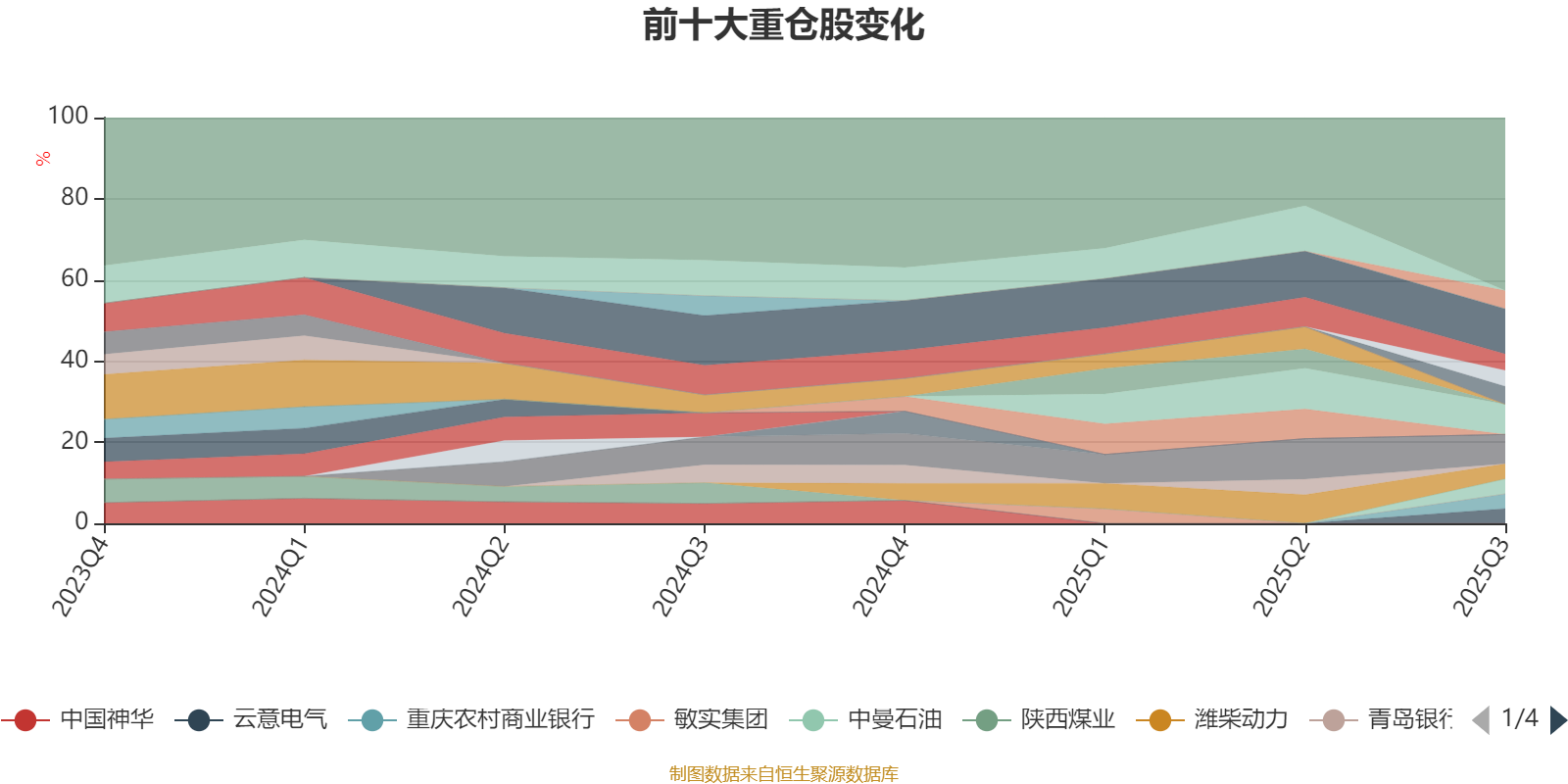 该基金持股集中度较高。截至2025年三季度末,基金重仓股分别是齐鲁银行、建设银行、渝农商行、中国巨石、恩华药业、招商轮船、英科医疗、潍柴动力、中曼石油、云意电气、重庆农村商业银行。