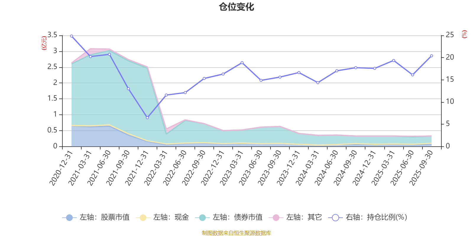 据定期报告数据统计,近三年平均股票仓位为17.08%,同类平均为19.14%。2020年末基金达到24.86%的最高仓位,2021年末最低,为6.47%。
