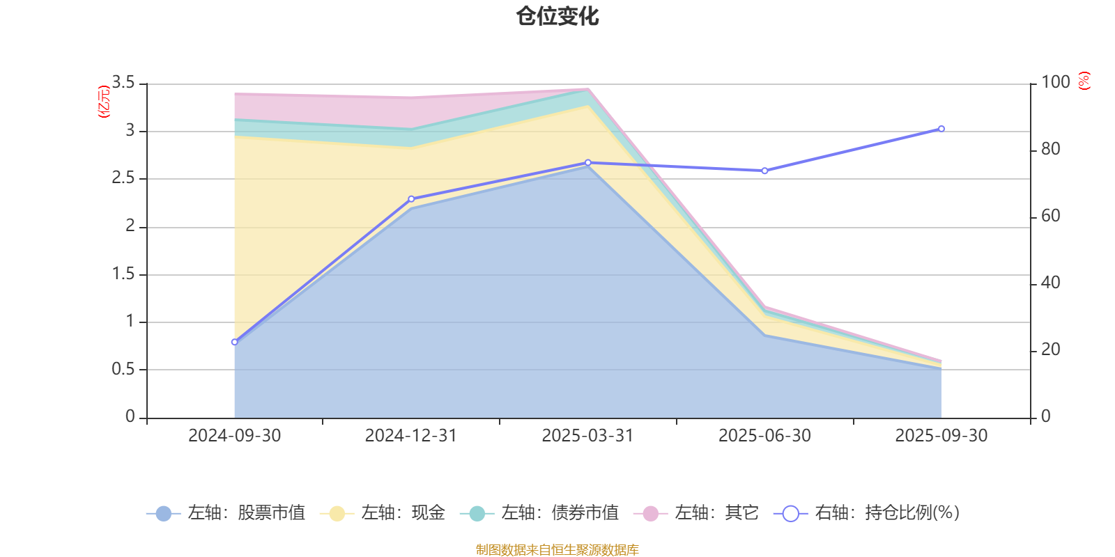 据定期报告数据统计,成立以来平均股票仓位为64.98%,同类平均为83.73%。2025年三季度末基金达到86.47%的最高仓位,2024年三季度末最低,为22.66%。
