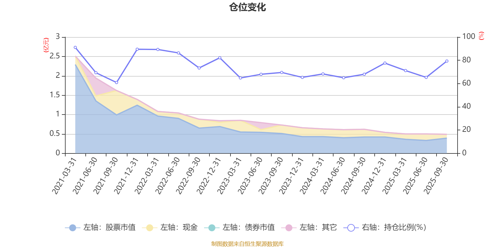据定期报告数据统计,近三年平均股票仓位为70.38%,同类平均为83.73%。2021年一季度末基金达到91.11%的最高仓位,2021年三季度末最低,为60.89%。