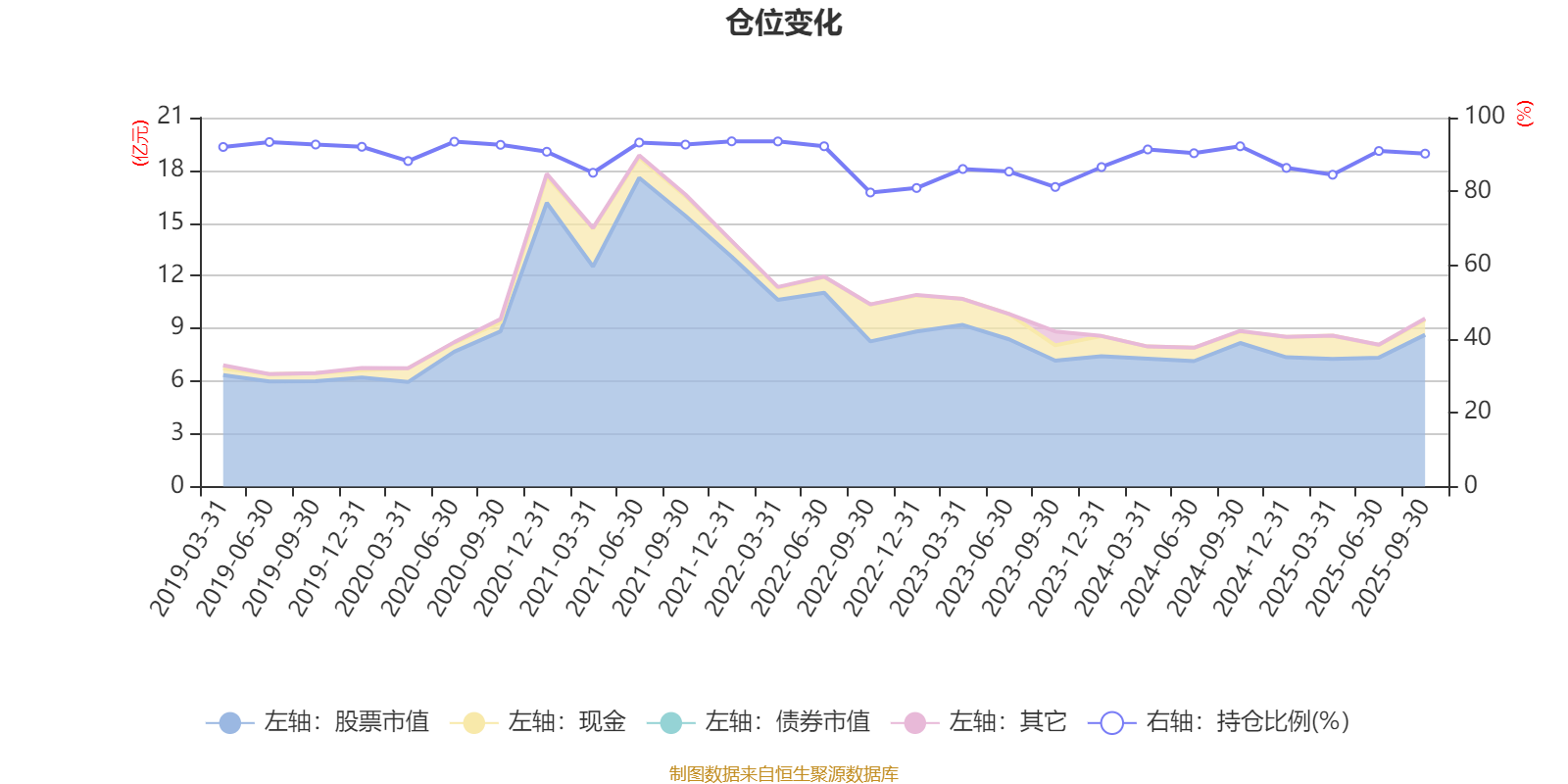 据定期报告数据统计,近三年平均股票仓位为87.18%,同类平均为88.27%。2021年末基金达到93.57%的最高仓位,2022年三季度末最低,为79.7%。