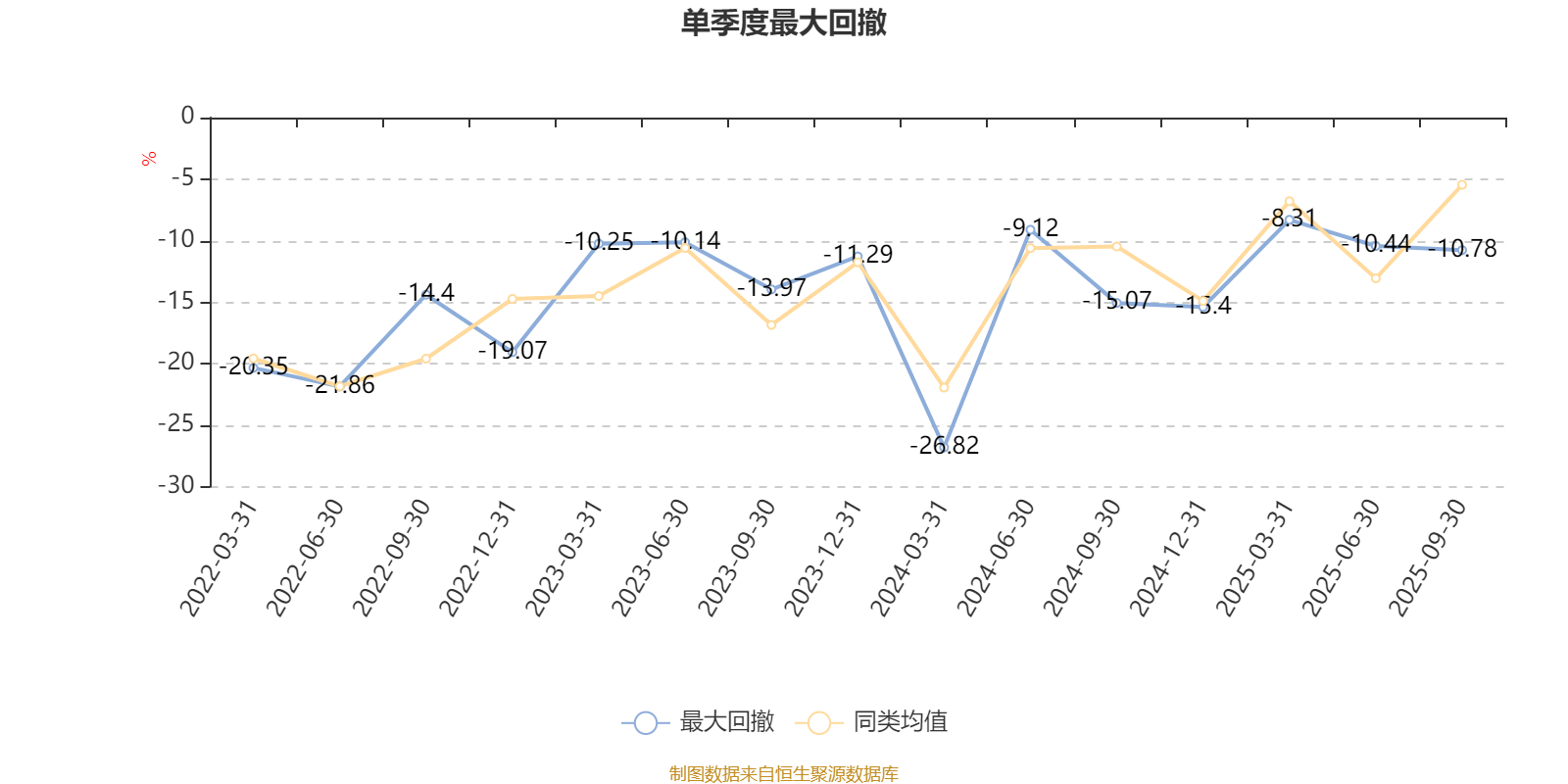 截至10月27日,基金近三年最大回撤为49.85%,同类可比基金排名17/29。单季度最大回撤出现在2024年一季度,为26.82%。