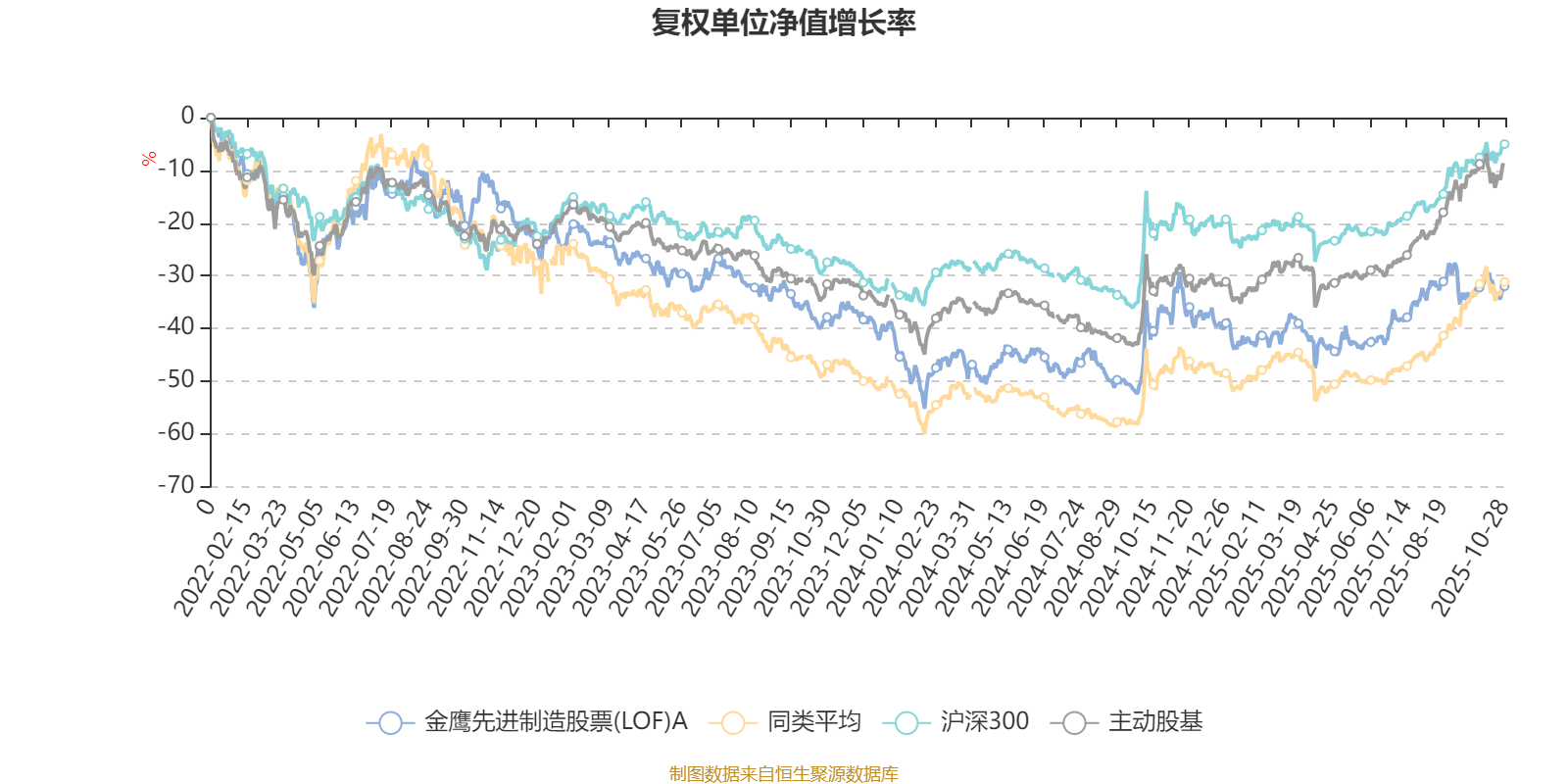 截至10月28日,金鹰先进制造股票(LOF)A近三个月复权单位净值增长率为2.61%,位于同类可比基金37/39;近半年复权单位净值增长率为23.26%,位于同类可比基金35/39;近一年复权单位净值增长率为6.22%,位于同类可比基金36/38;近三年复权单位净值增长率为-22.41%,位于同类可比基金28/29。