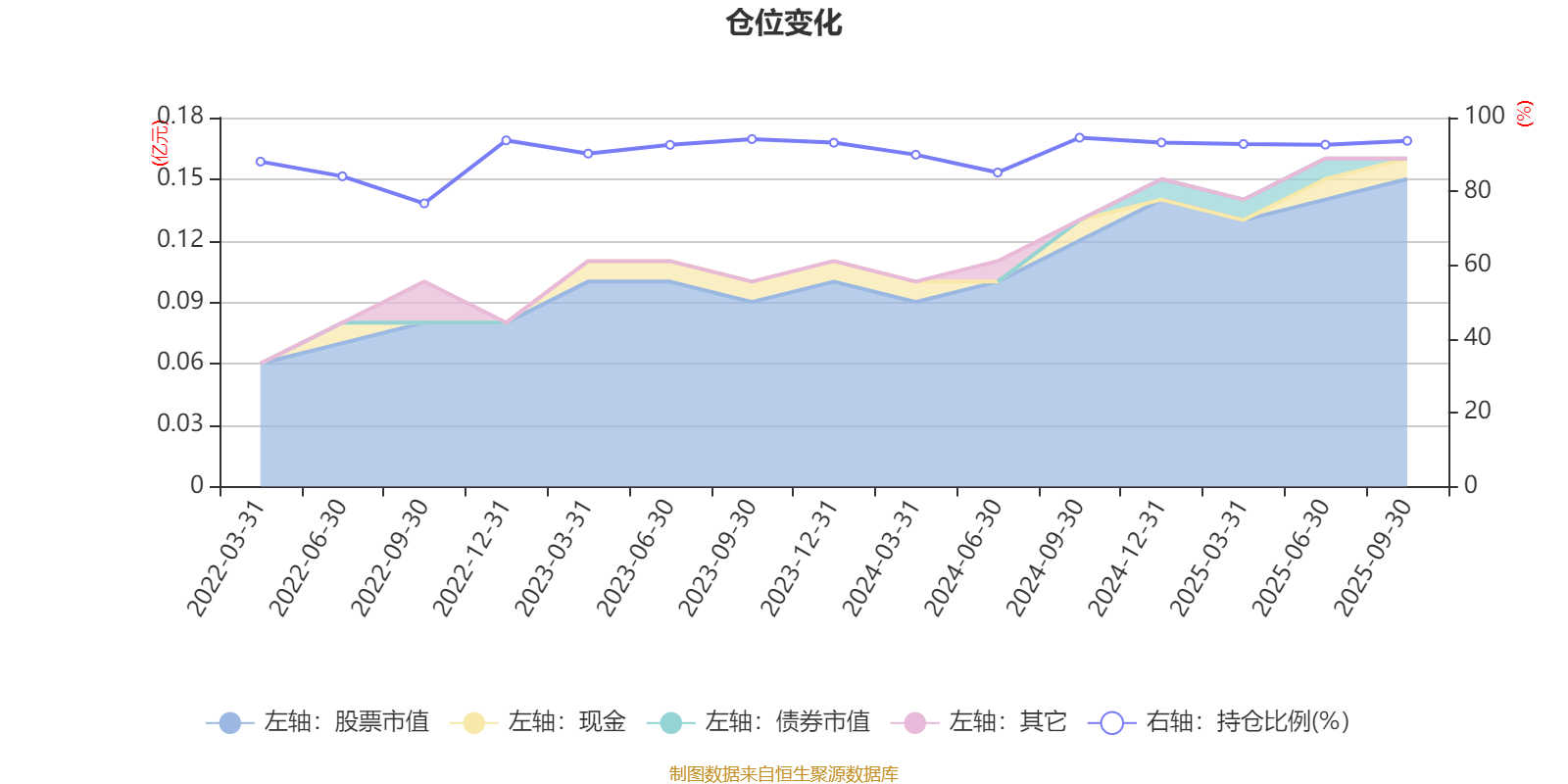 据定期报告数据统计,近三年平均股票仓位为92.18%,同类平均为87.59%。2024年三季度末基金达到94.55%的最高仓位,2022年三季度末最低,为76.75%。