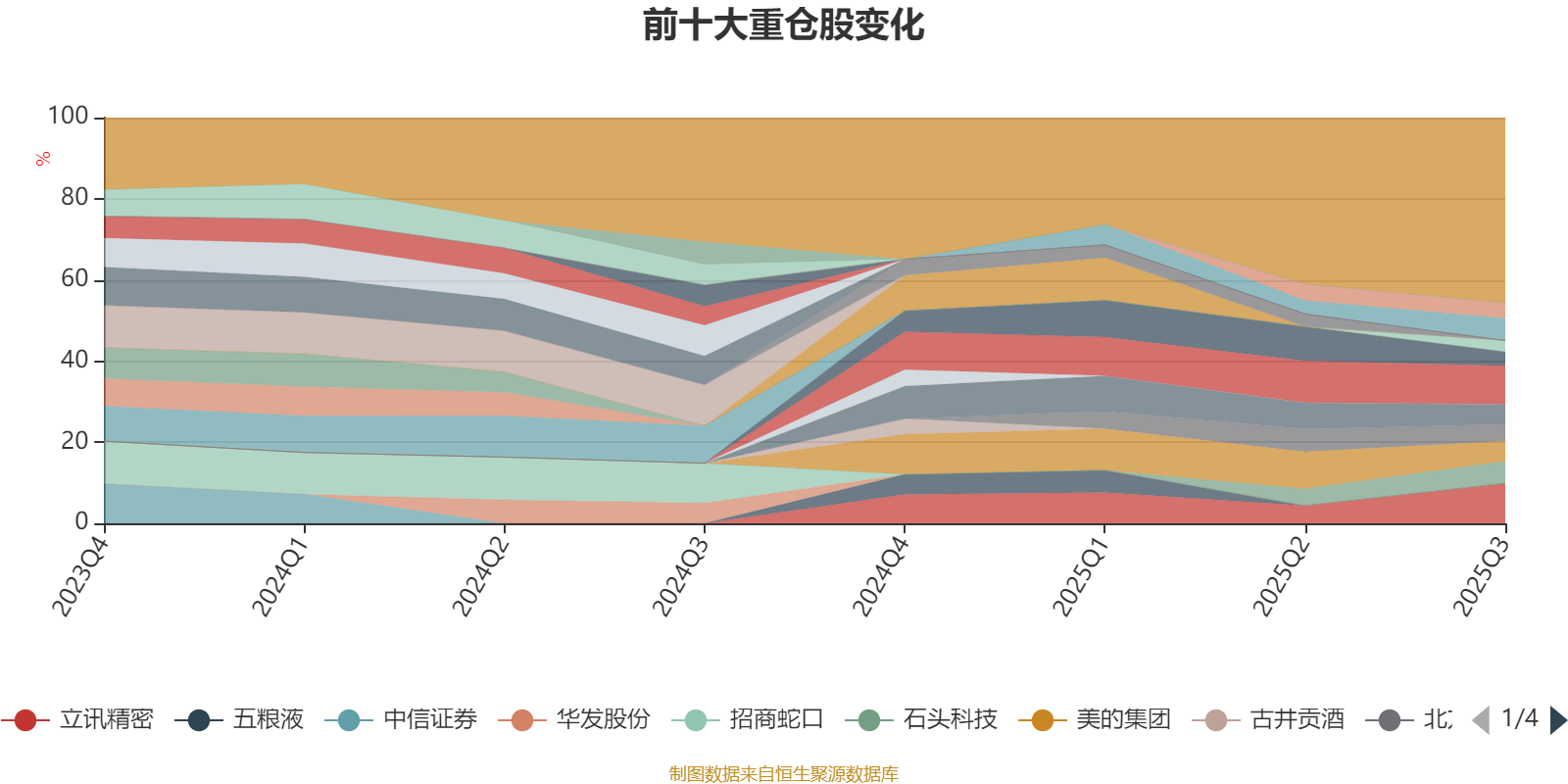 该基金持股集中度较高。截至2025年三季度末,基金十大重仓股分别是立讯精密、宁德时代、东鹏饮料、石头科技、美的集团、贵州茅台、北方华创、顺络电子、九号公司、长川科技。