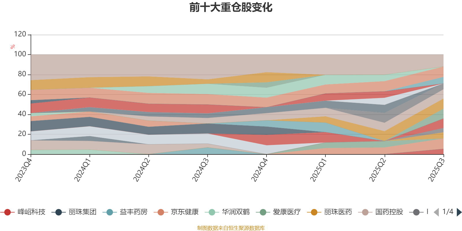 该基金持股集中度较高,近2年前十大重仓股集中度长期超过60%。截至2025年三季度末,基金重仓股分别是京东健康、可孚医疗、三生制药、爱博医疗、人福医药、医脉通、美好医疗、丽珠医药、固生堂、峰岹科技、FORTIOR(01304)、丽珠集团。