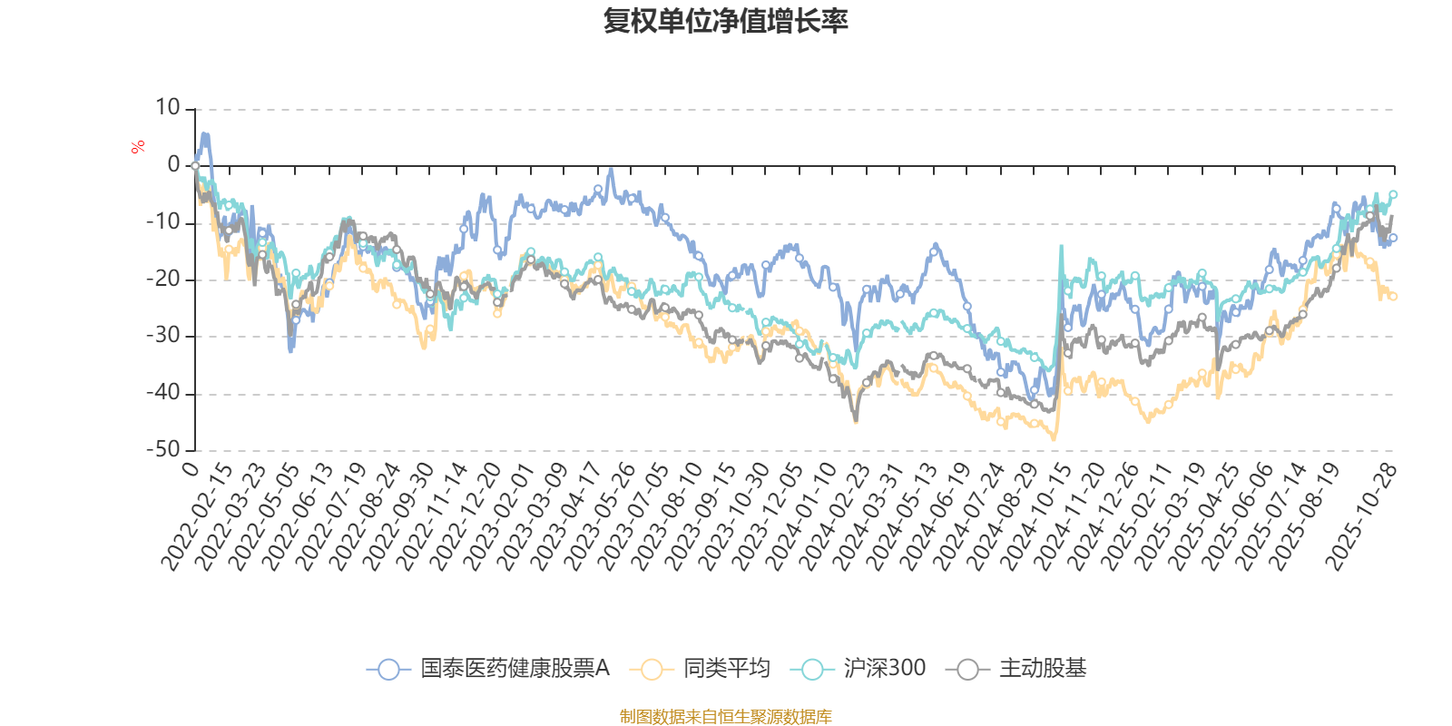 截至10月28日,国泰医药健康股票A近三个月复权单位净值增长率为-0.13%,位于同类可比基金8/57;近半年复权单位净值增长率为18.52%,位于同类可比基金40/57;近一年复权单位净值增长率为15.43%,位于同类可比基金40/55;近三年复权单位净值增长率为8.28%,位于同类可比基金17/48。