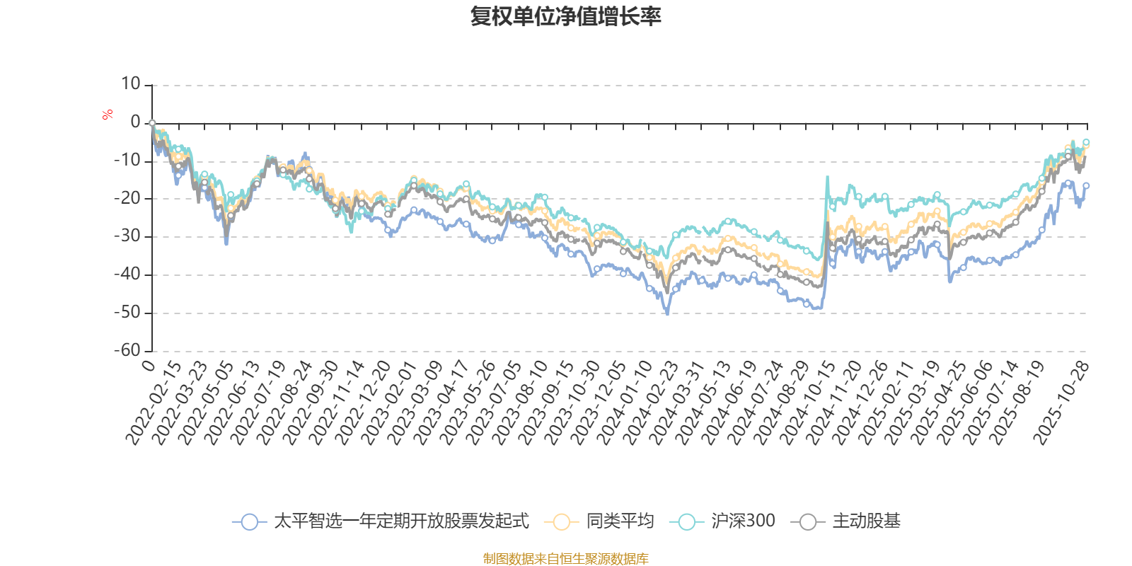 截至10月28日,太平智选一年定期开放股票发起式近三个月复权单位净值增长率为22.49%,位于同类可比基金45/167;近半年复权单位净值增长率为34.93%,位于同类可比基金62/166;近一年复权单位净值增长率为23.93%,位于同类可比基金104/164;近三年复权单位净值增长率为7.76%,位于同类可比基金115/156。