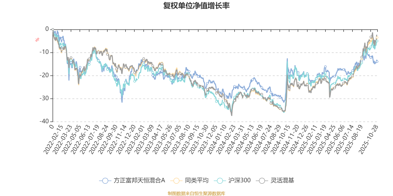 截至10月28日,方正富邦天恒混合A近三个月复权单位净值增长率为0.66%,位于同类可比基金1180/1287;近半年复权单位净值增长率为8.32%,位于同类可比基金1061/1287;近一年复权单位净值增长率为4.60%,位于同类可比基金1133/1287;近三年复权单位净值增长率为24.01%,位于同类可比基金477/1286。