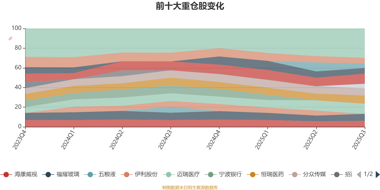 该基金持股集中度较高,且持股标的较为稳定,近2年前十大重仓股集中度长期超过60%。截至2025年三季度末,基金十大重仓股分别是迈瑞医疗、腾讯控股、恒瑞医药、福耀玻璃、分众传媒、海康威视、贵州茅台、美的集团、三生制药、美团-W。