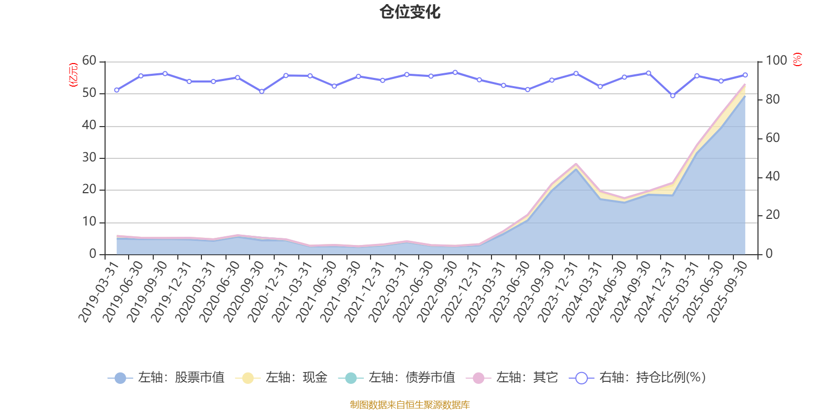 据定期报告数据统计,近三年平均股票仓位为89.88%,同类平均为88.29%。2022年三季度末基金达到94.35%的最高仓位,2024年末最低,为82.3%。