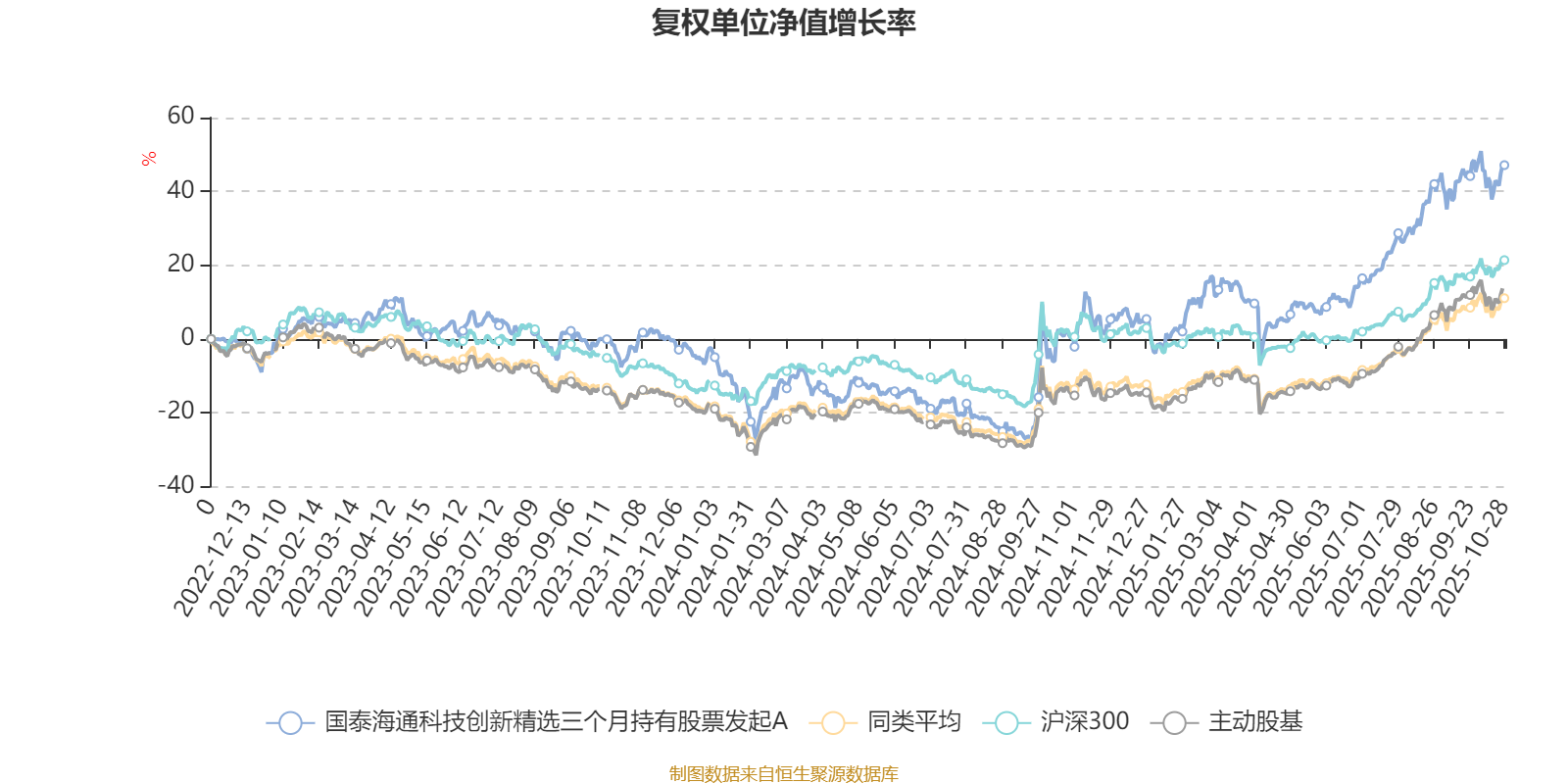 截至10月28日,国泰海通科技创新精选三个月持有股票发起A近三个月复权单位净值增长率为15.55%,位于同类可比基金54/121;近半年复权单位净值增长率为40.56%,位于同类可比基金31/121;近一年复权单位净值增长率为43.48%,位于同类可比基金18/115。