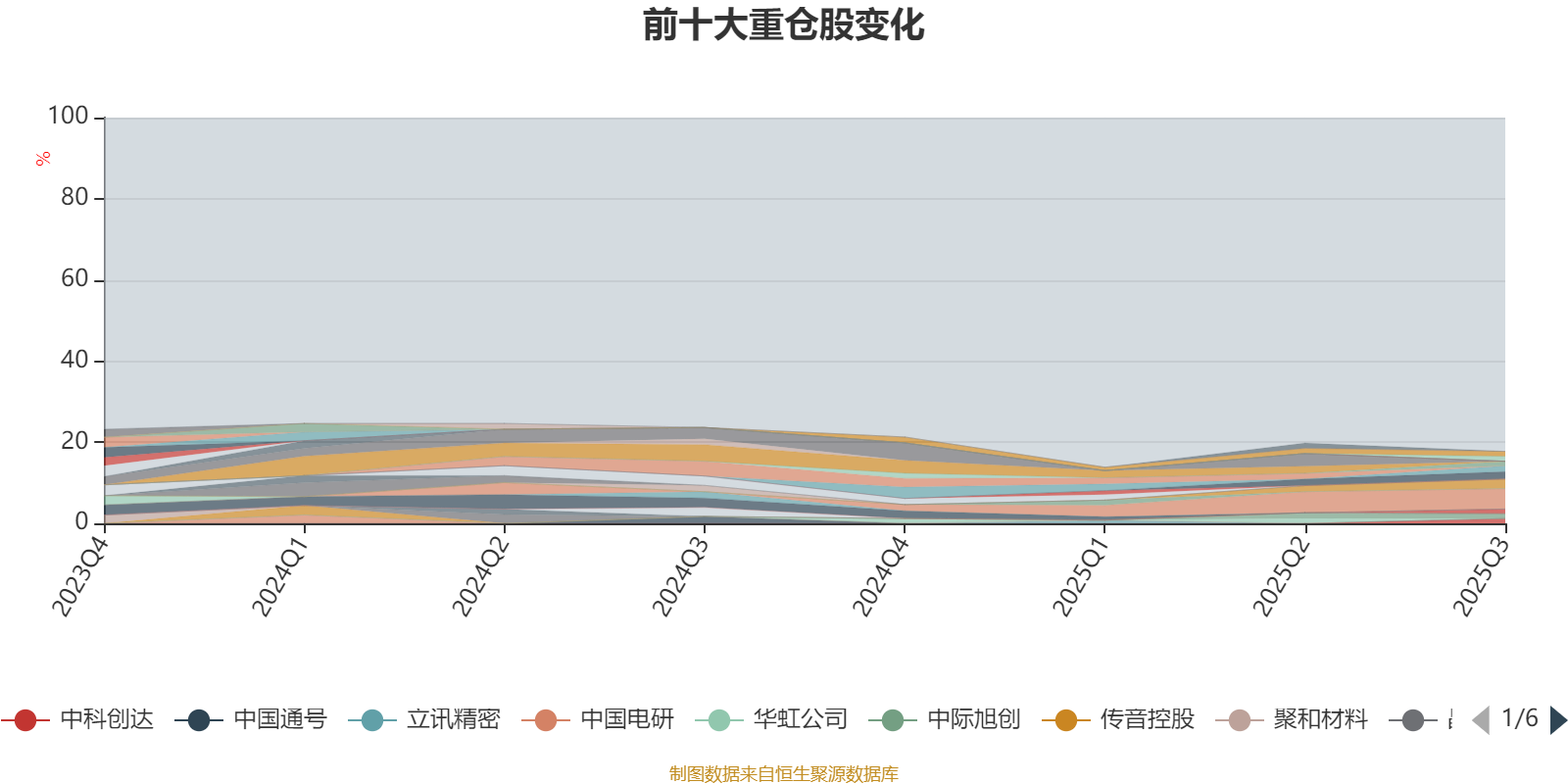 截至2025年三季度末,基金十大重仓股分别是宁德时代、东方财富、汇川技术、寒武纪、芯联集成、新易盛、中科创达、格科微、中际旭创、伟测科技。