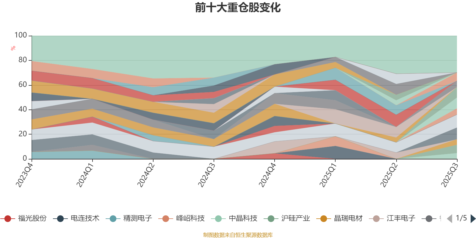 该基金持股集中度较高,近2年前十大重仓股集中度长期超过60%。截至2025年三季度末,基金十大重仓股分别是北方华创、中微公司、长川科技、寒武纪、中芯国际、沪硅产业、中科飞测、至纯科技、中晶科技、晶瑞电材。