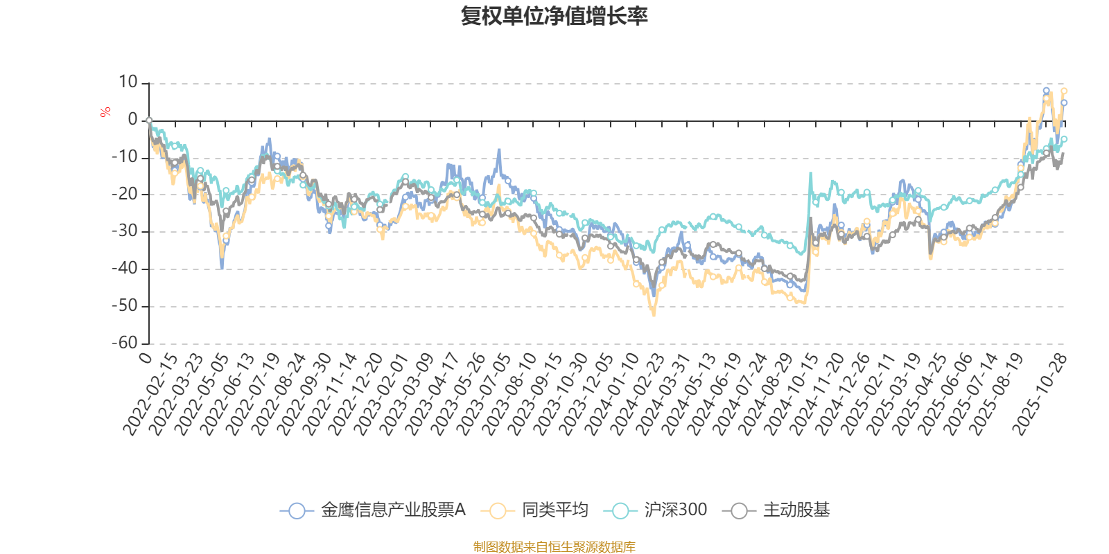 截至10月28日,金鹰信息产业股票A近三个月复权单位净值增长率为36.91%,位于同类可比基金31/63;近半年复权单位净值增长率为50.25%,位于同类可比基金35/63;近一年复权单位净值增长率为48.05%,位于同类可比基金40/61;近三年复权单位净值增长率为42.37%,位于同类可比基金31/51。
