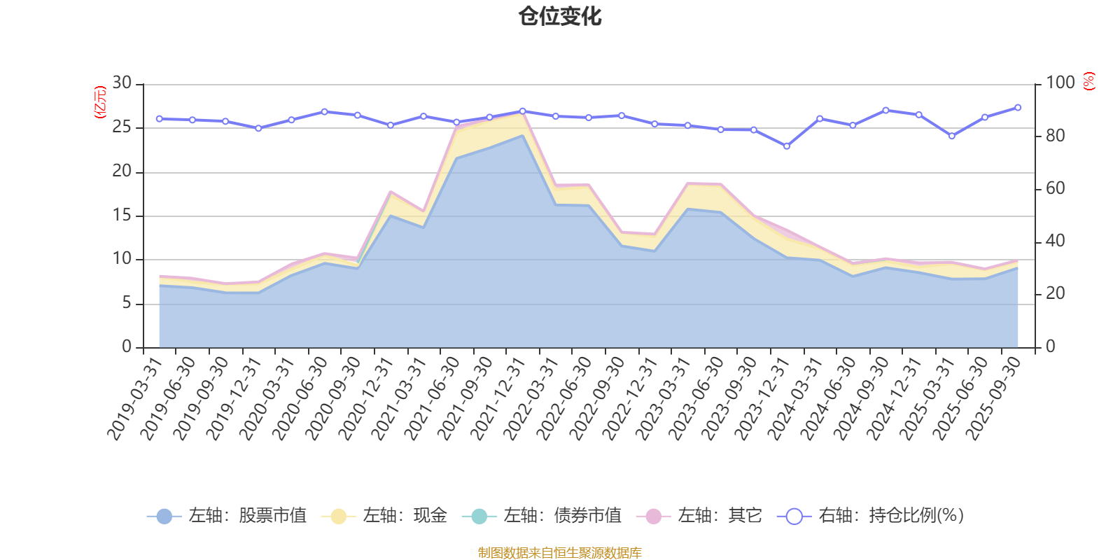 据定期报告数据统计,近三年平均股票仓位为84.93%,同类平均为88.29%。2025年三季度末基金达到91.08%的最高仓位,2023年末最低,为76.43%。