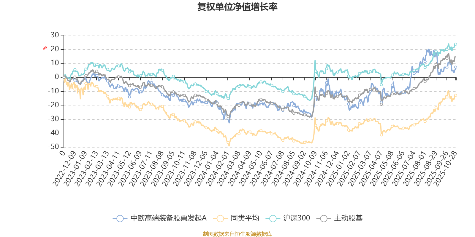 截至10月28日,中欧高端装备股票发起A近三个月复权单位净值增长率为-4.60%,位于同类可比基金38/39;近半年复权单位净值增长率为23.28%,位于同类可比基金34/39;近一年复权单位净值增长率为17.41%,位于同类可比基金32/38。