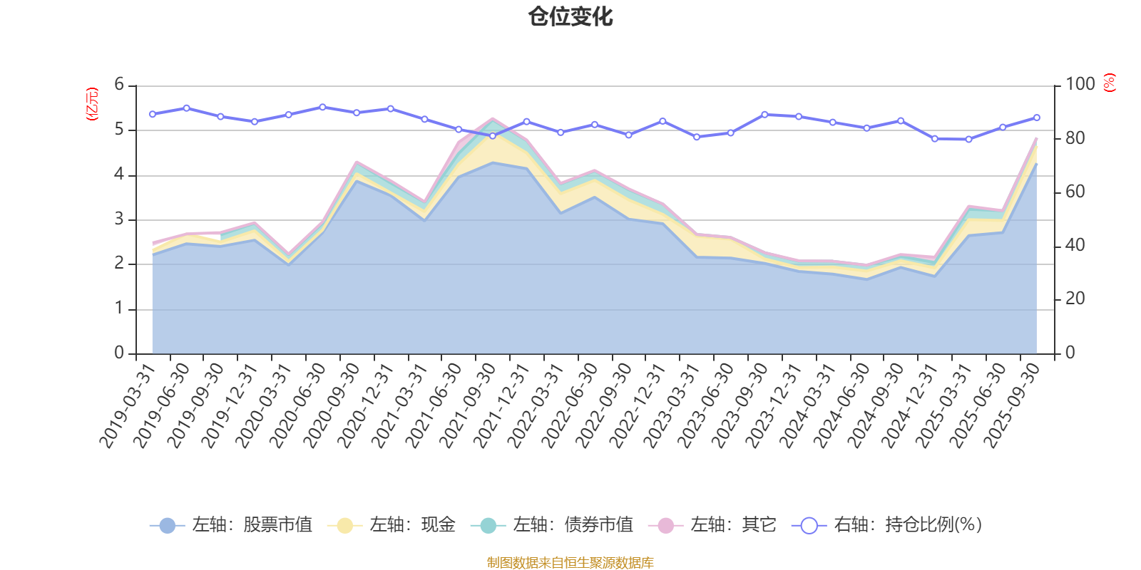 据定期报告数据统计,近三年平均股票仓位为84.78%,同类平均为88.27%。2020年上半年末基金达到91.96%的最高仓位,2025年一季度末最低,为79.95%。
