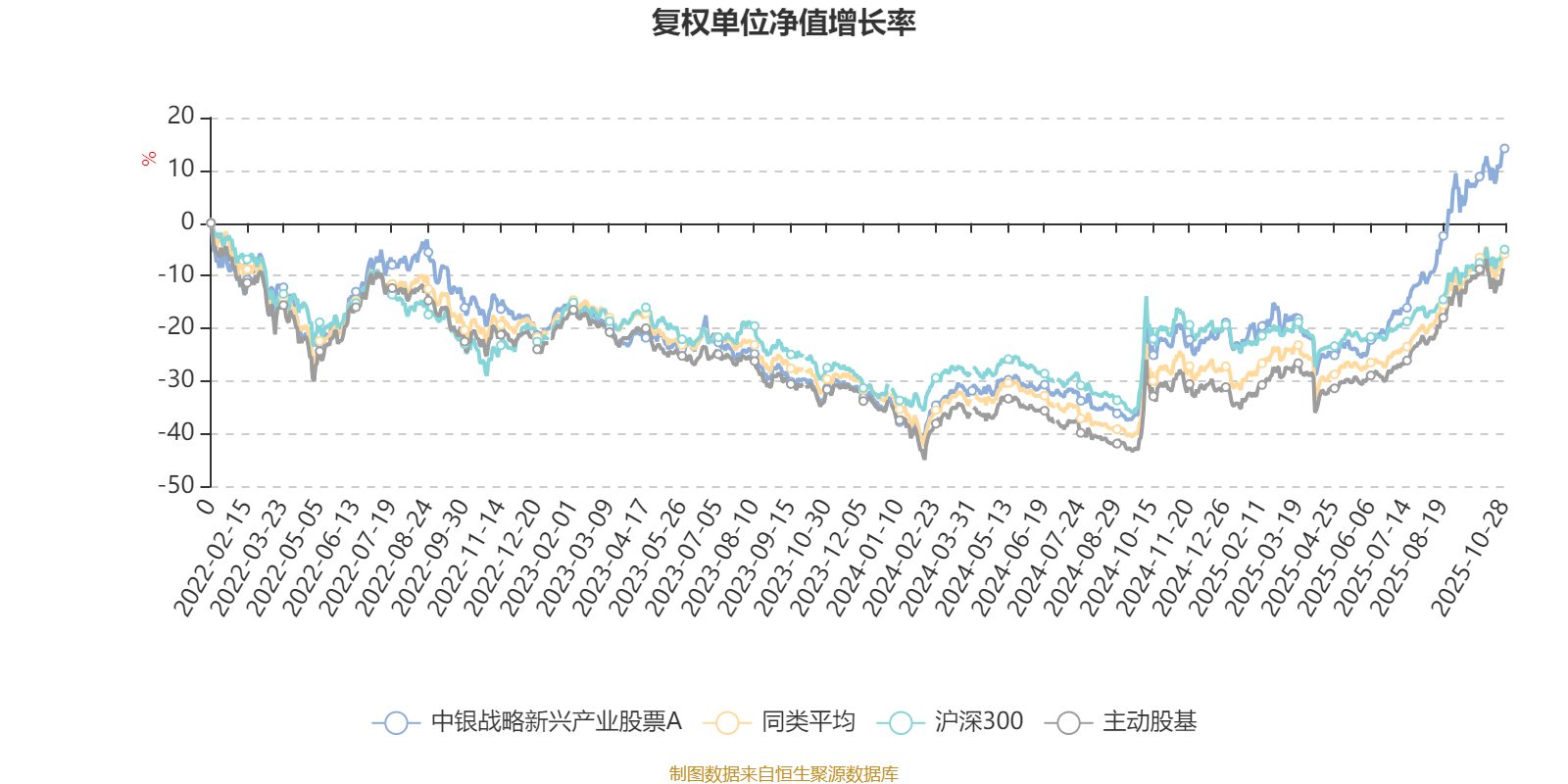 截至10月28日,中银战略新兴产业股票A近三个月复权单位净值增长率为27.70%,位于同类可比基金27/167;近半年复权单位净值增长率为52.56%,位于同类可比基金19/166;近一年复权单位净值增长率为46.76%,位于同类可比基金25/164;近三年复权单位净值增长率为41.55%,位于同类可比基金45/156。