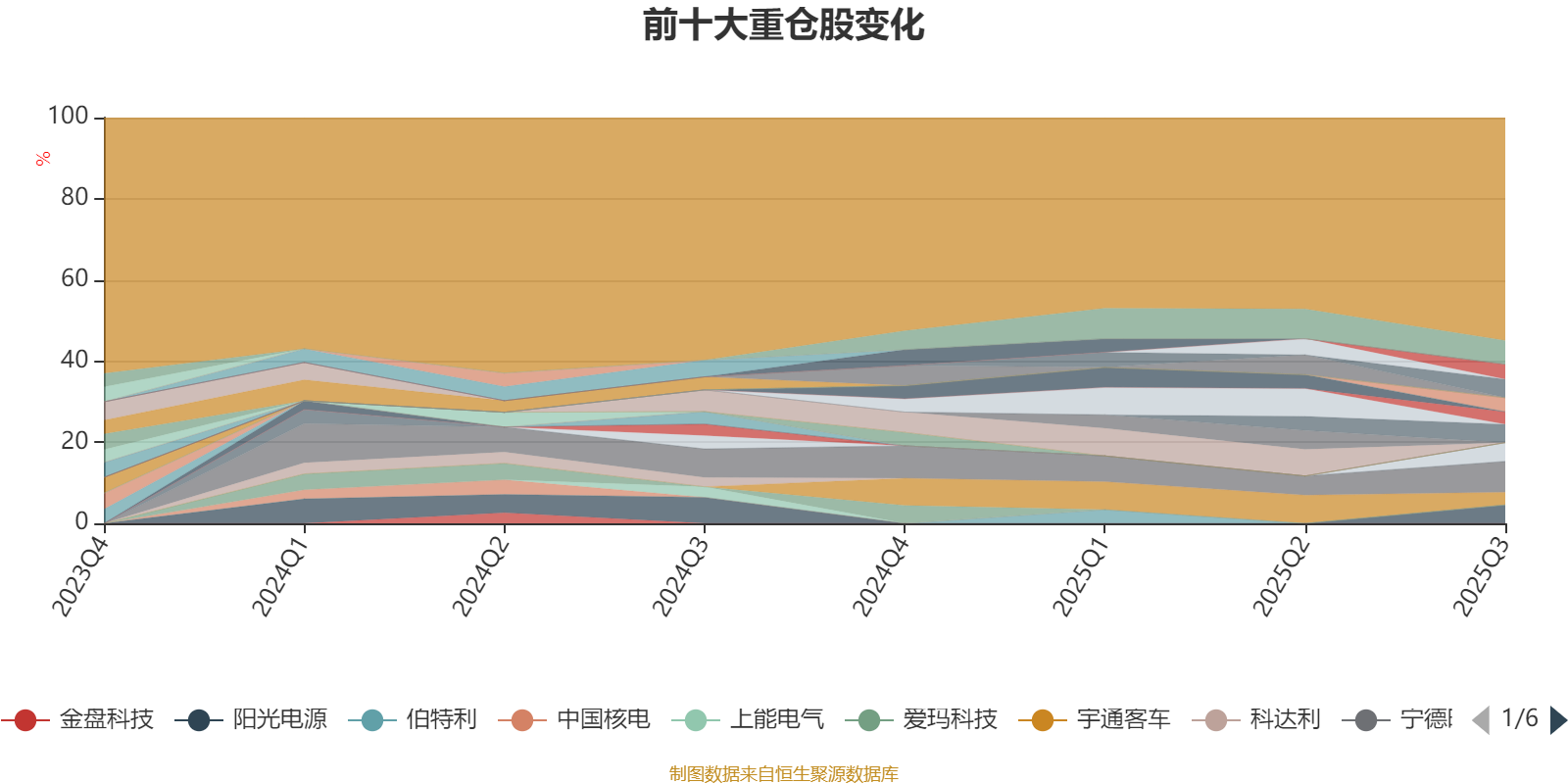 截至2025年三季度末,基金十大重仓股分别是宁德时代、小鹏汽车-W、阿特斯、速腾聚创、阳光电源、地平线机器人-W、亿纬锂能、德赛西威、宇通客车、银轮股份。