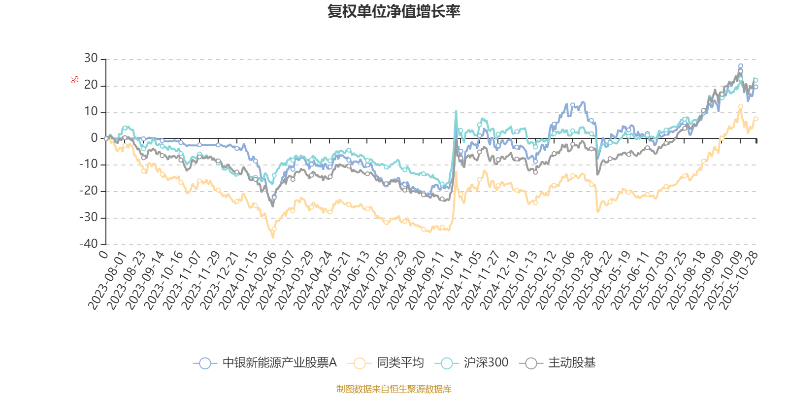 截至10月28日,中银新能源产业股票A近三个月复权单位净值增长率为13.34%,位于同类可比基金33/39;近半年复权单位净值增长率为19.37%,位于同类可比基金38/39;近一年复权单位净值增长率为21.33%,位于同类可比基金29/38。