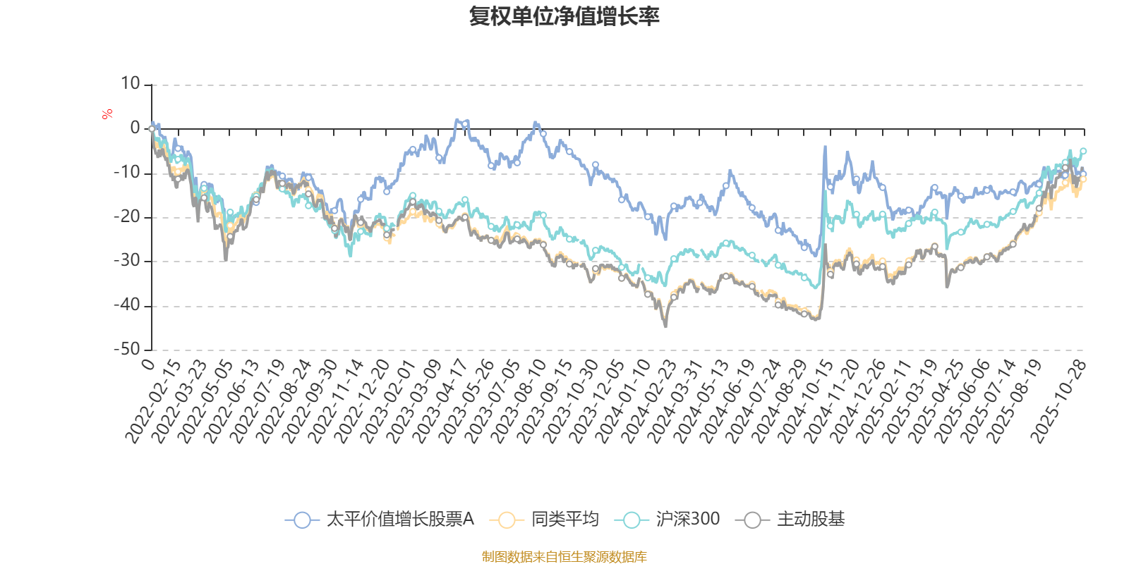 截至10月28日,太平价值增长股票A近三个月复权单位净值增长率为2.34%,位于同类可比基金103/121;近半年复权单位净值增长率为7.27%,位于同类可比基金112/121;近一年复权单位净值增长率为-1.00%,位于同类可比基金111/115;近三年复权单位净值增长率为18.34%,位于同类可比基金50/87。