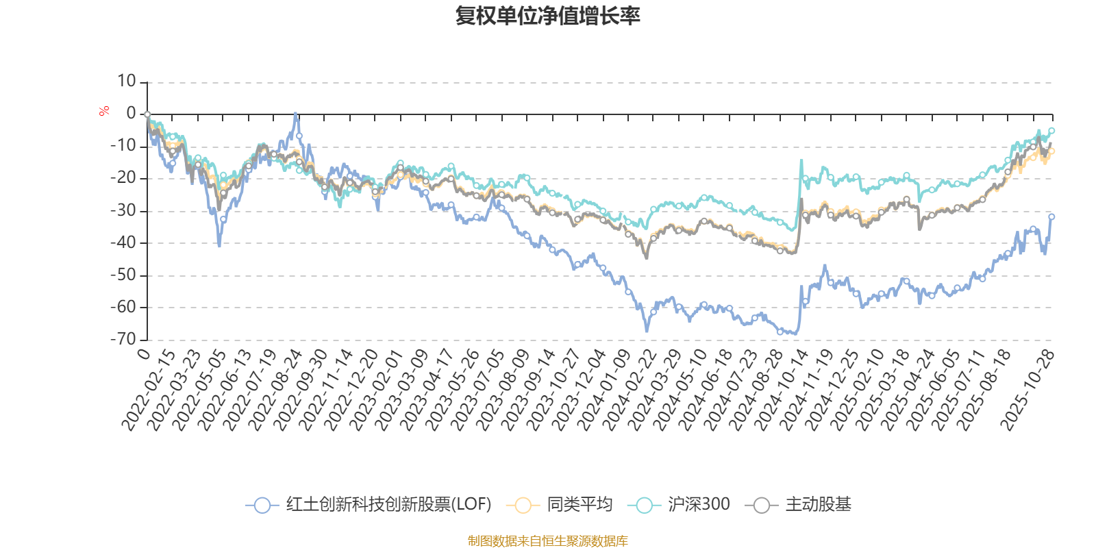 截至10月28日,红土创新科技创新股票(LOF)近三个月复权单位净值增长率为27.59%,位于同类可比基金17/121;近半年复权单位净值增长率为54.62%,位于同类可比基金8/121;近一年复权单位净值增长率为44.14%,位于同类可比基金16/115;近三年复权单位净值增长率为-15.80%,位于同类可比基金81/87。
