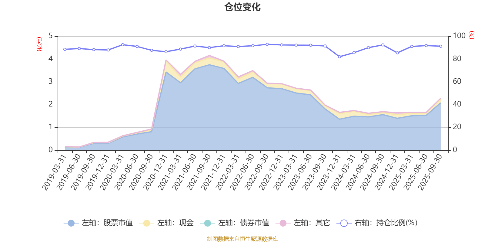 据定期报告数据统计,近三年平均股票仓位为89.86%,同类平均为88.29%。2022年三季度末基金达到92.93%的最高仓位,2023年末最低,为82.06%。