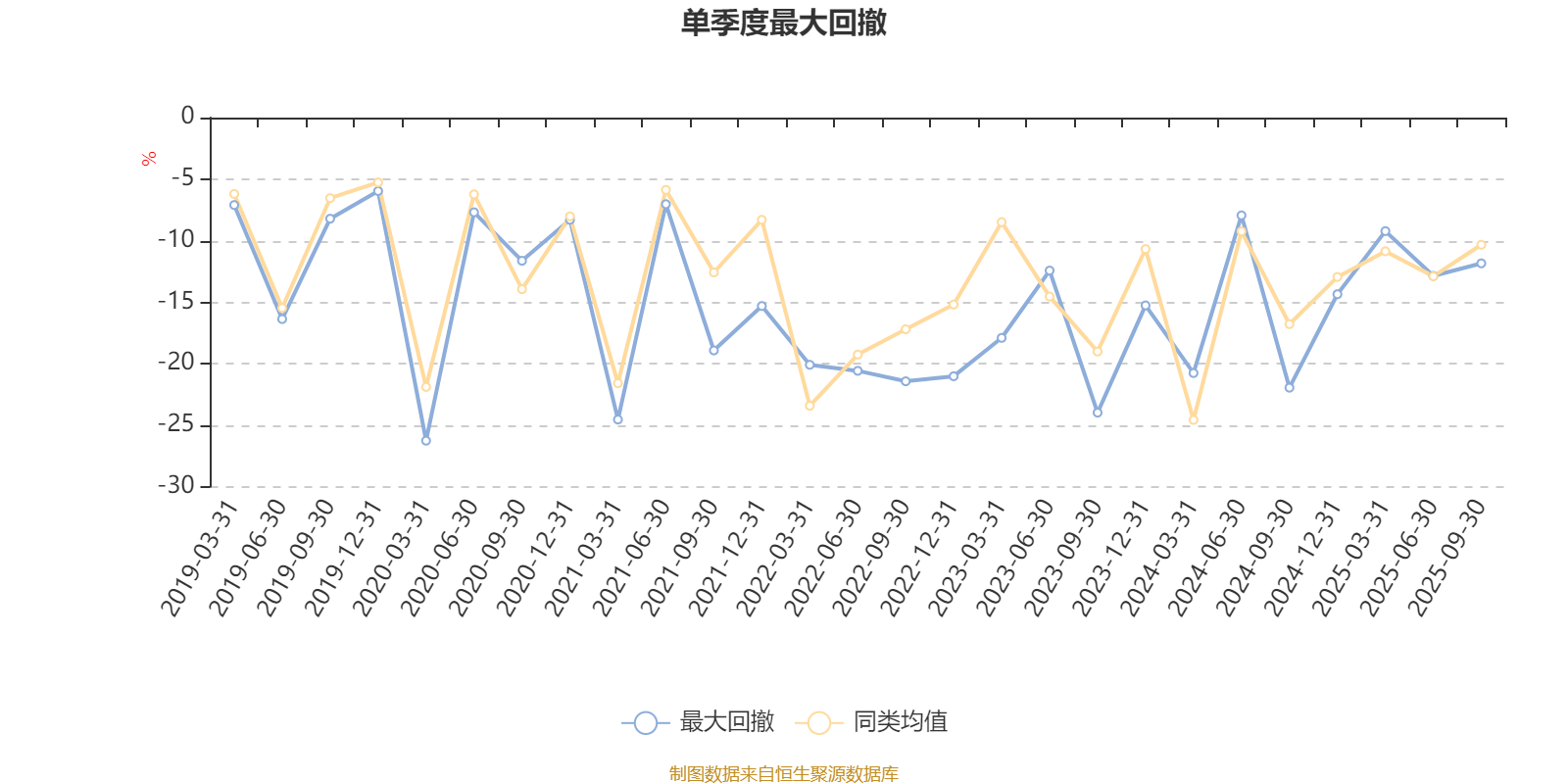 截至10月27日,基金近三年最大回撤为55.74%,同类可比基金排名48/51。单季度最大回撤出现在2020年一季度,为26.27%。