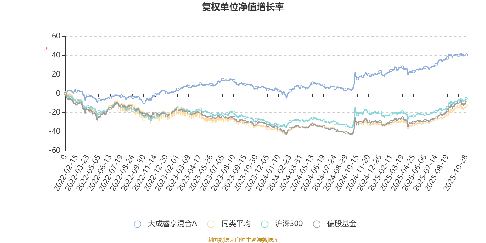 截至10月28日,大成睿享混合A近三个月复权单位净值增长率为4.01%,位于同类可比基金16/20;近半年复权单位净值增长率为14.56%,位于同类可比基金16/20;近一年复权单位净值增长率为17.98%,位于同类可比基金14/20;近三年复权单位净值增长率为50.80%,位于同类可比基金3/19。