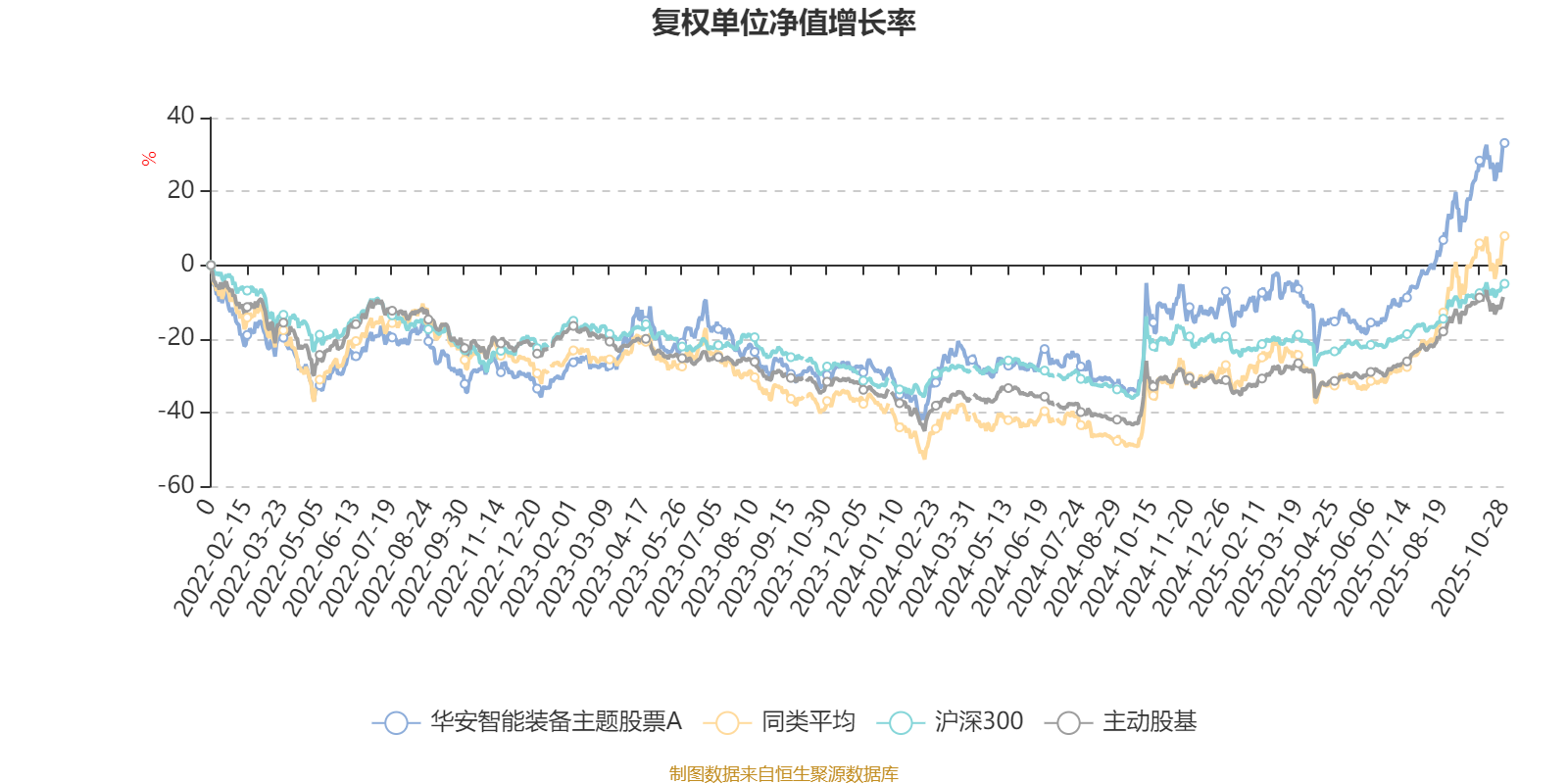 截至10月28日,华安智能装备主题股票A近三个月复权单位净值增长率为36.90%,位于同类可比基金32/63;近半年复权单位净值增长率为57.39%,位于同类可比基金31/63;近一年复权单位净值增长率为50.61%,位于同类可比基金35/61;近三年复权单位净值增长率为89.08%,位于同类可比基金10/51。