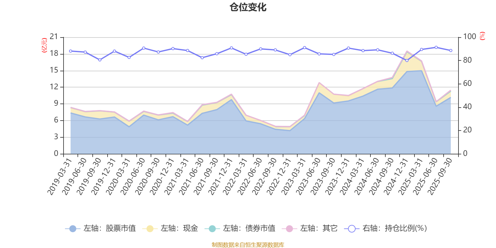 据定期报告数据统计,近三年平均股票仓位为87.59%,同类平均为88.29%。2025年上半年末基金达到91.32%的最高仓位,2024年末最低,为80.05%。