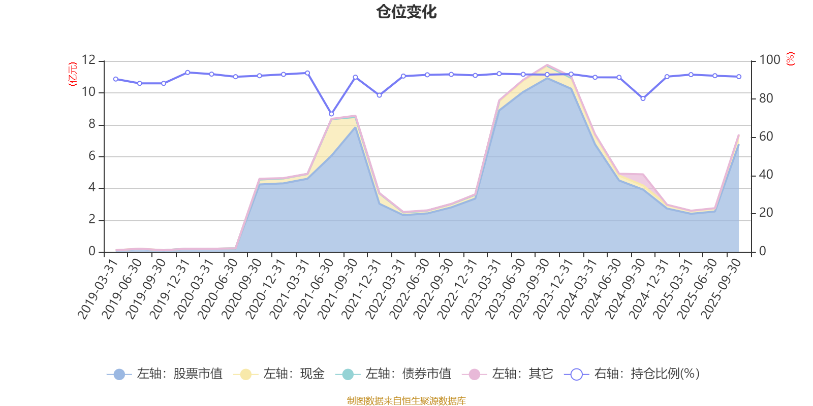 据定期报告数据统计,近三年平均股票仓位为91.36%,同类平均为88.27%。2019年末基金达到93.95%的最高仓位,2021年上半年末最低,为72.24%。
