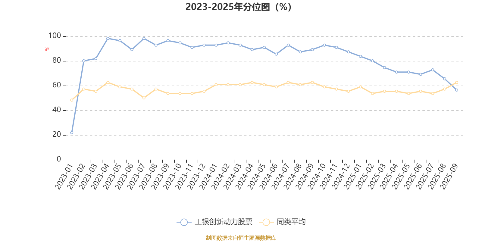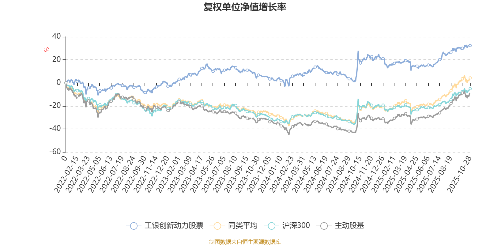 截至10月28日,工银创新动力股票近三个月复权单位净值增长率为5.44%,位于同类可比基金48/58;近半年复权单位净值增长率为16.58%,位于同类可比基金45/57;近一年复权单位净值增长率为8.66%,位于同类可比基金53/57;近三年复权单位净值增长率为44.96%,位于同类可比基金19/56。
