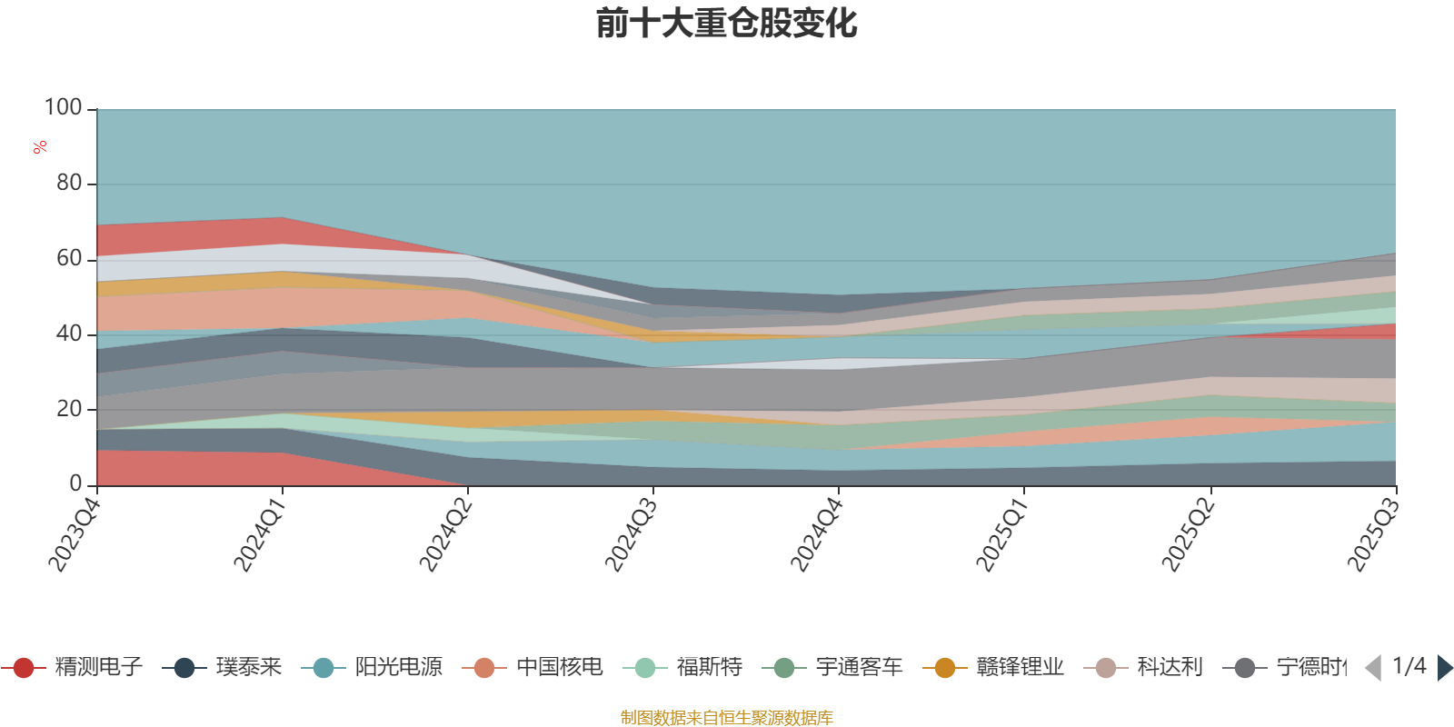 该基金持股集中度较高。截至2025年三季度末,基金十大重仓股分别是阳光电源、宁德时代、科达利、璞泰来、亿纬锂能、宇通客车、新泉股份、思源电气、湖南裕能、中天科技。