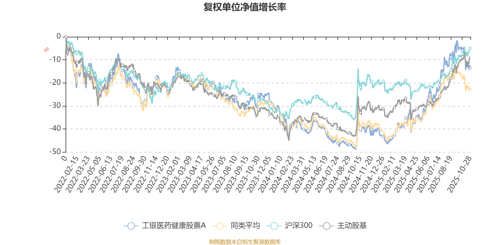 截至10月28日,工银医药健康股票A近三个月复权单位净值增长率为-1.86%,位于同类可比基金16/57;近半年复权单位净值增长率为33.99%,位于同类可比基金5/57;近一年复权单位净值增长率为42.28%,位于同类可比基金10/55;近三年复权单位净值增长率为12.43%,位于同类可比基金14/48。