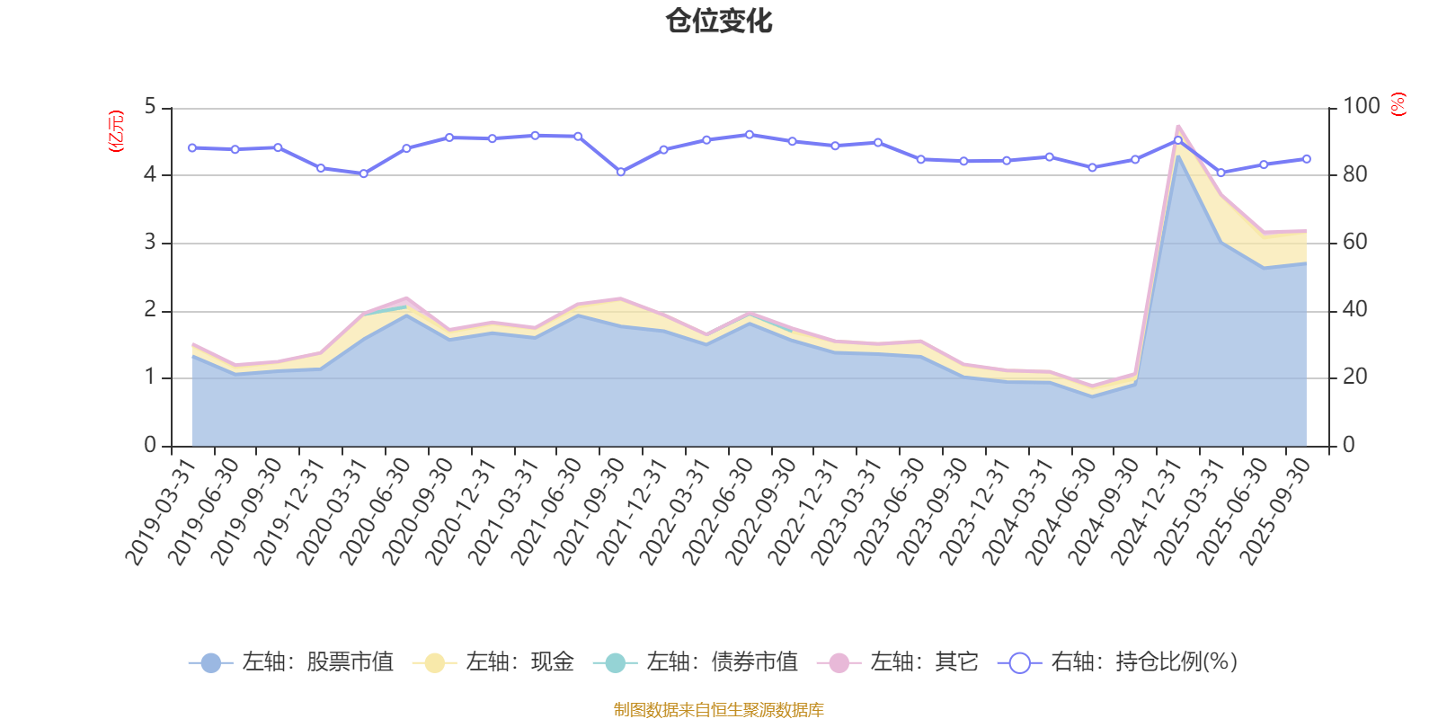 据定期报告数据统计,近三年平均股票仓位为85.34%,同类平均为88.27%。2022年上半年末基金达到92.12%的最高仓位,2020年一季度末最低,为80.57%。
