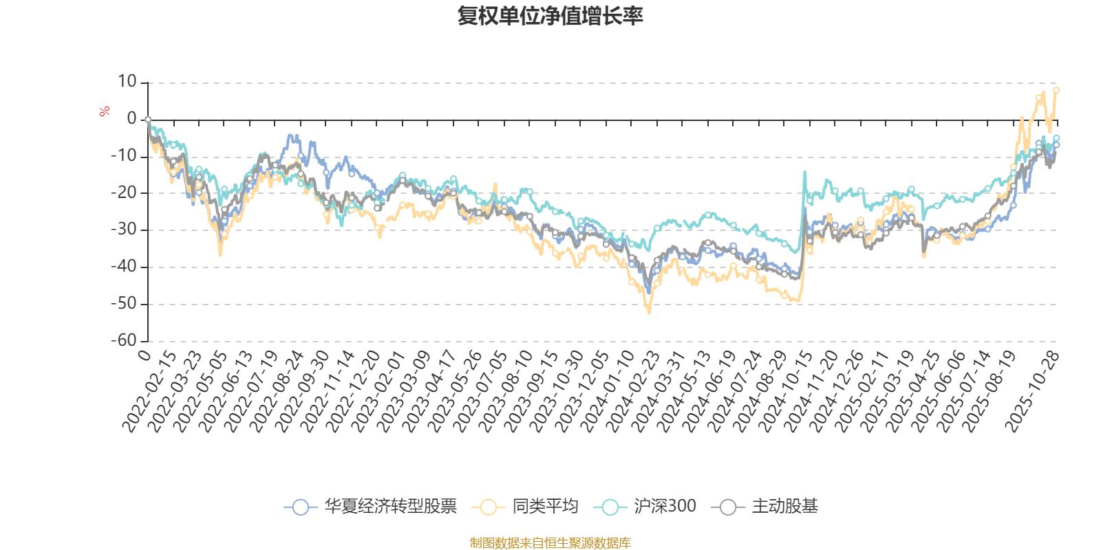 截至10月28日,华夏经济转型股票近三个月复权单位净值增长率为26.84%,位于同类可比基金47/63;近半年复权单位净值增长率为34.67%,位于同类可比基金48/63;近一年复权单位净值增长率为28.90%,位于同类可比基金51/61;近三年复权单位净值增长率为8.24%,位于同类可比基金47/51。