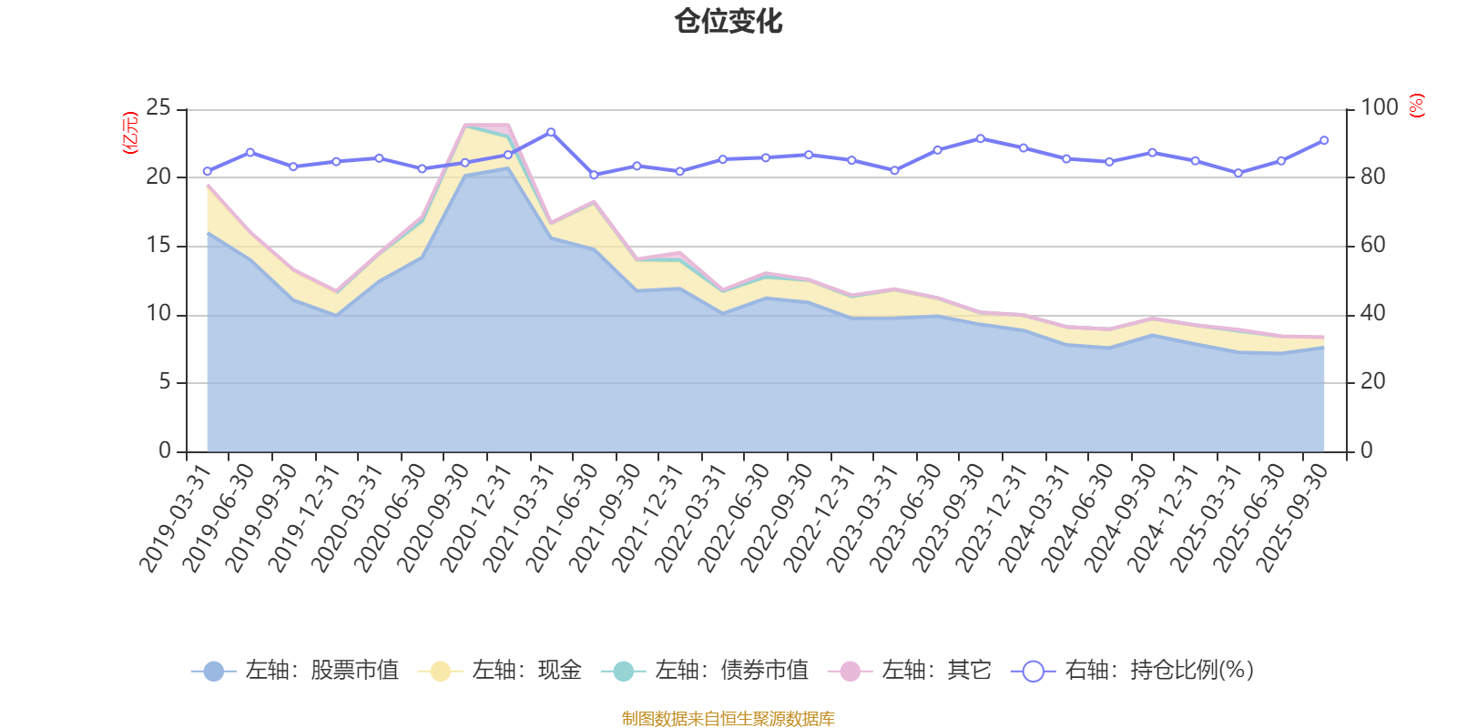 据定期报告数据统计,近三年平均股票仓位为86.26%,同类平均为88.29%。2021年一季度末基金达到93.31%的最高仓位,2021年上半年末最低,为80.82%。