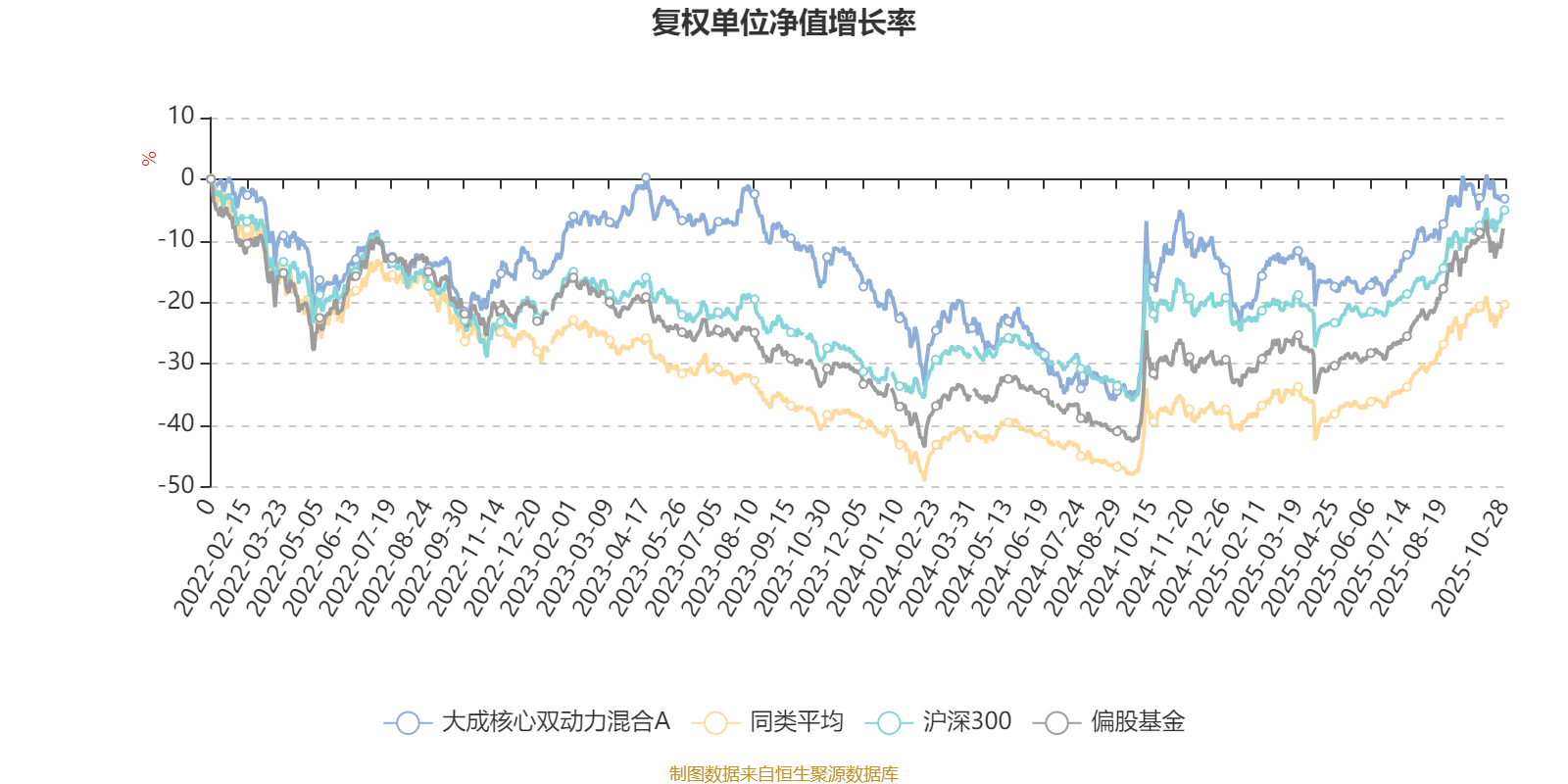 截至10月28日,大成核心双动力混合A近三个月复权单位净值增长率为5.88%,位于同类可比基金539/689;近半年复权单位净值增长率为18.50%,位于同类可比基金509/688;近一年复权单位净值增长率为8.17%,位于同类可比基金581/653;近三年复权单位净值增长率为22.63%,位于同类可比基金144/364。