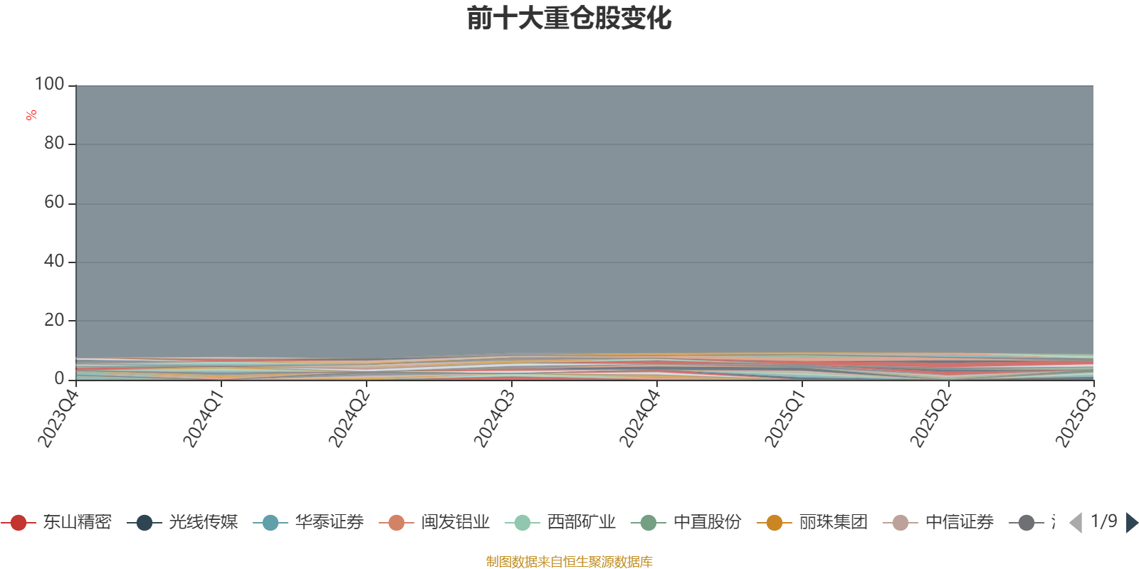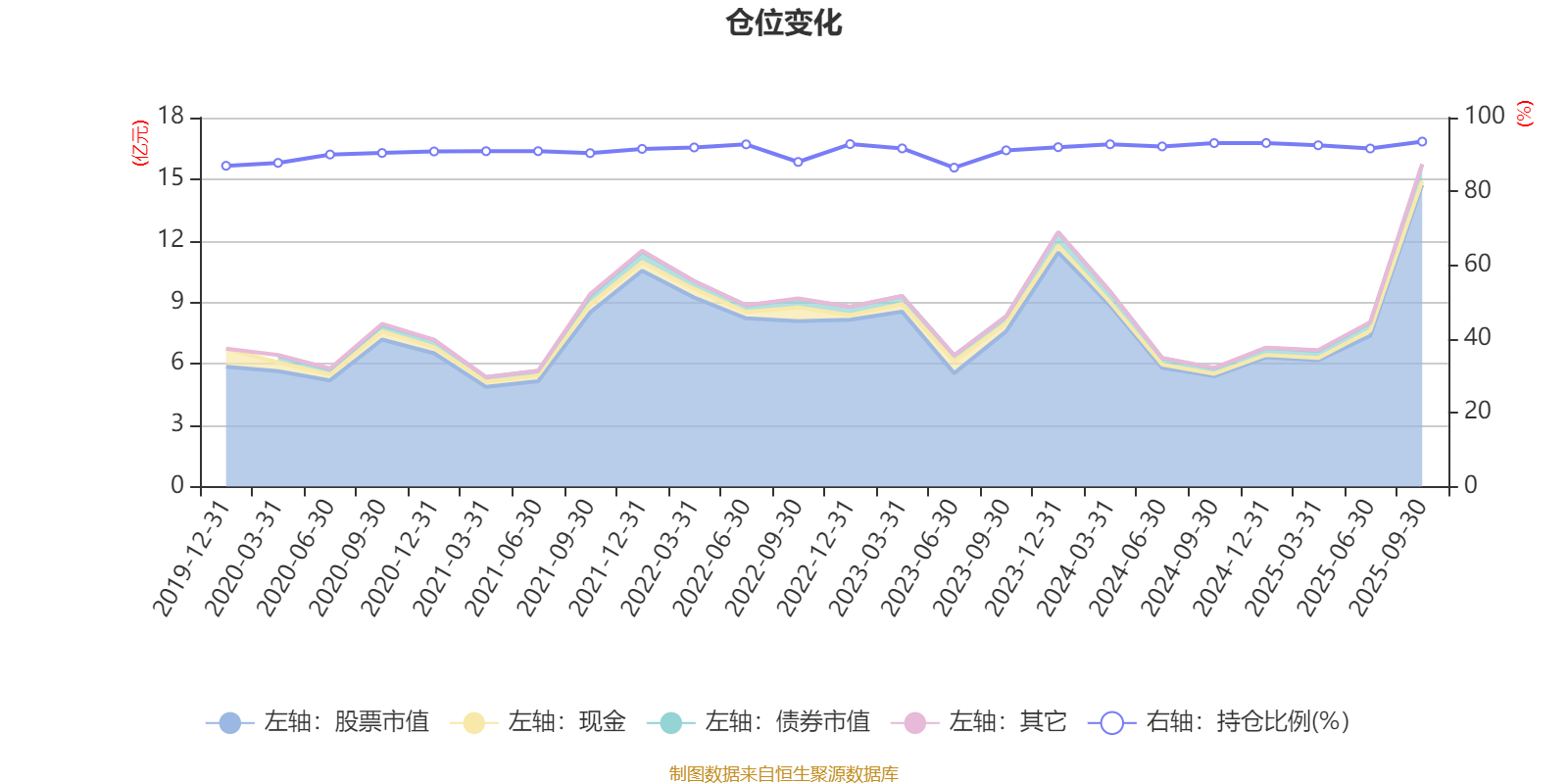 据定期报告数据统计,近三年平均股票仓位为91.9%,同类平均为88.27%。2025年三季度末基金达到93.5%的最高仓位,2023年上半年末最低,为86.44%。