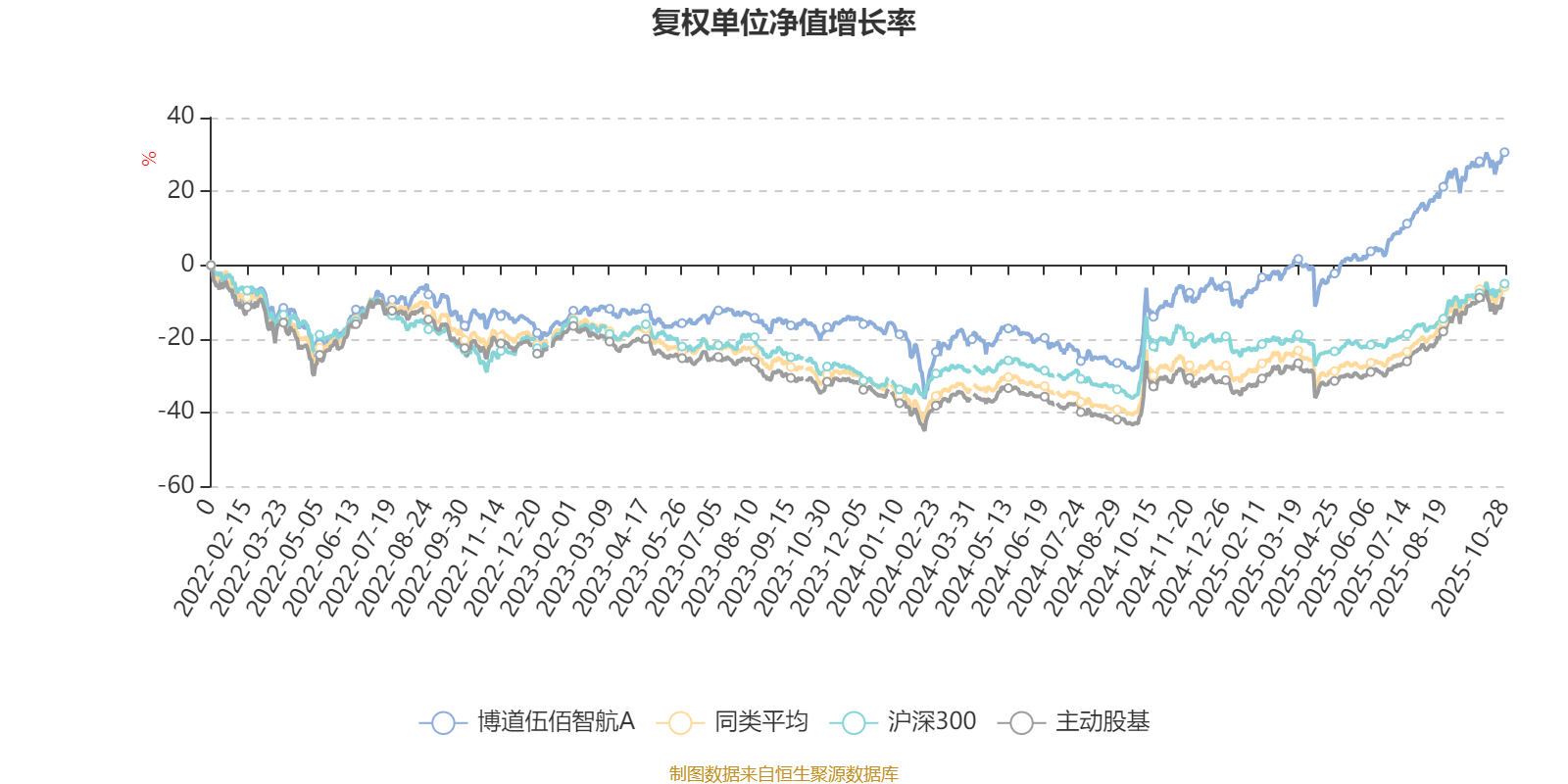 截至10月28日,博道伍佰智航A近三个月复权单位净值增长率为12.32%,位于同类可比基金103/167;近半年复权单位净值增长率为34.44%,位于同类可比基金66/166;近一年复权单位净值增长率为44.49%,位于同类可比基金32/164;近三年复权单位净值增长率为57.48%,位于同类可比基金24/156。