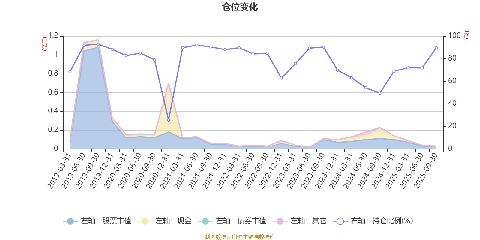 据定期报告数据统计,近三年平均股票仓位为71.28%,同类平均为72.35%。2019年三季度末基金达到92.74%的最高仓位,2020年末最低,为25.63%。