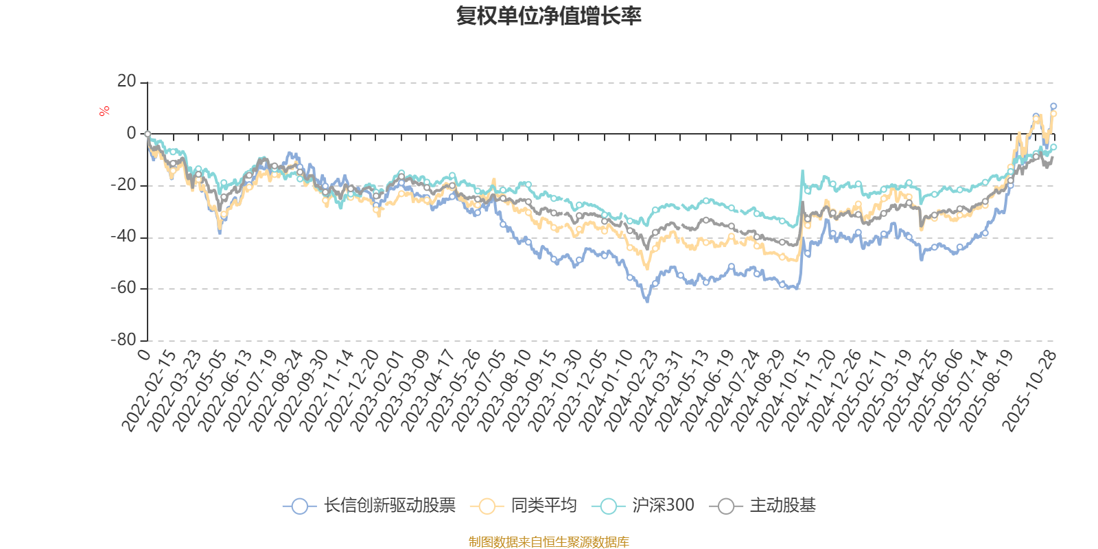 截至10月28日,长信创新驱动股票近三个月复权单位净值增长率为60.88%,位于同类可比基金3/63;近半年复权单位净值增长率为97.86%,位于同类可比基金8/63;近一年复权单位净值增长率为91.96%,位于同类可比基金5/61;近三年复权单位净值增长率为38.46%,位于同类可比基金34/51。