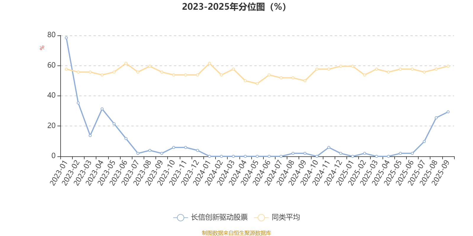 通过所选区间该基金净值增长率分位图,可以观察该基金与同类基金业绩比较情况。图为坐标原点到区间内某时点的净值增长率在同类基金中的分位数。