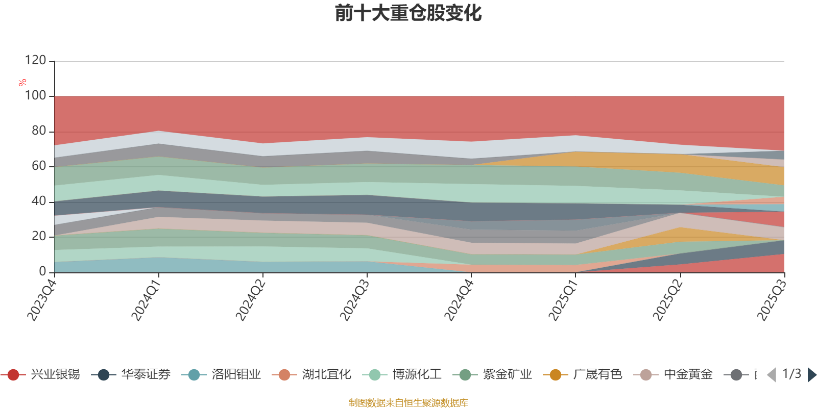 该基金持股集中度较高,近2年前十大重仓股集中度长期超过60%。截至2025年三季度末,基金十大重仓股分别是兴业银锡、山东黄金、锡业股份、华泰证券、中金黄金、赛轮轮胎、中国太保、海南橡胶、中国石油、招商轮船。