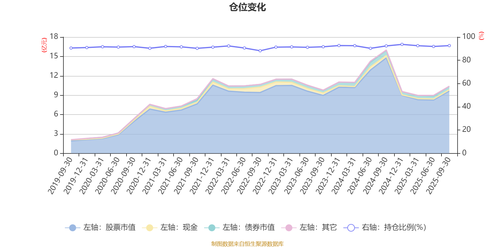 据定期报告数据统计,近三年平均股票仓位为92.04%,同类平均为88.27%。2024年末基金达到93.71%的最高仓位,2022年三季度末最低,为88.22%。